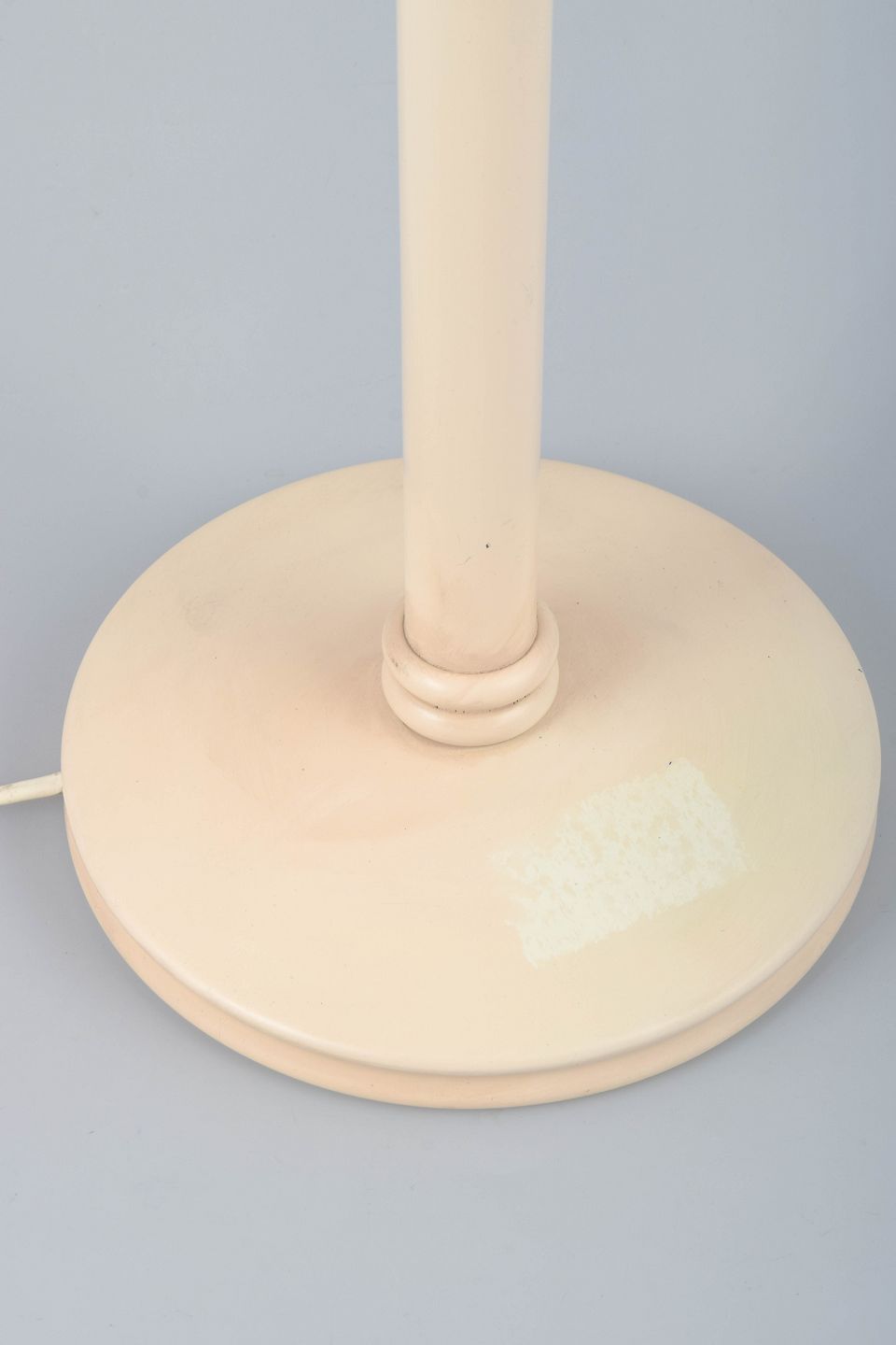 Bordlampe med konisk skærm i laksefarvet lakeret metal og stander i cremefarvet lakeret metal.