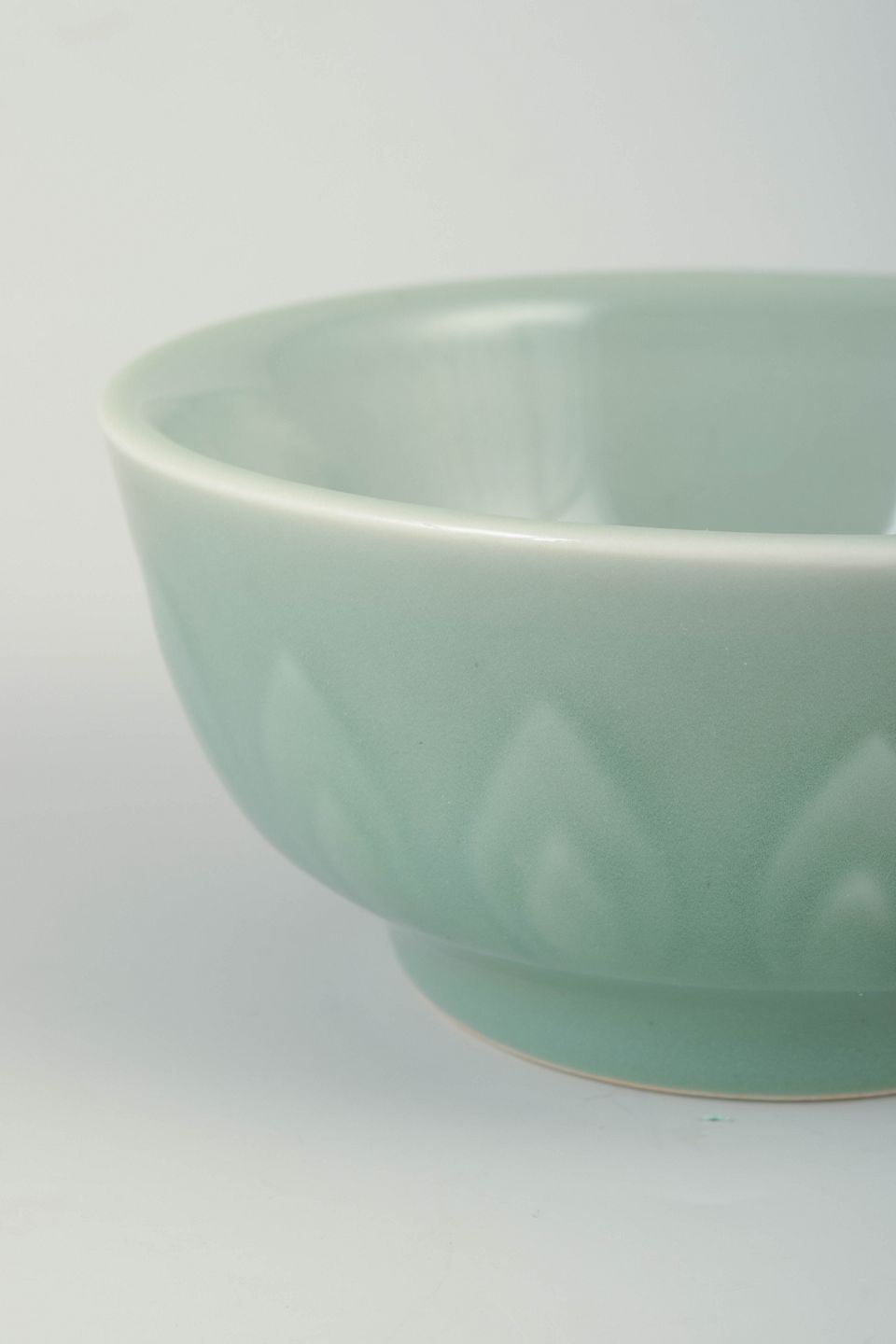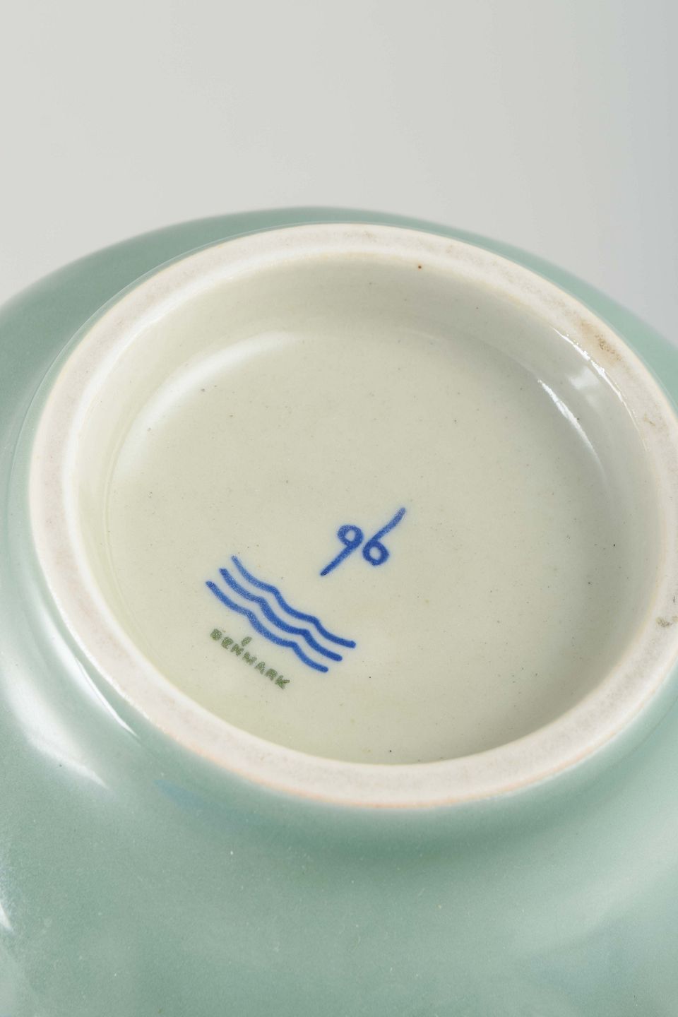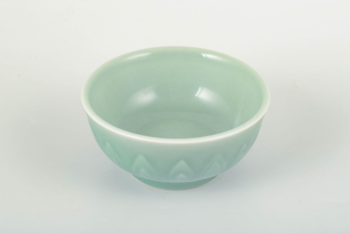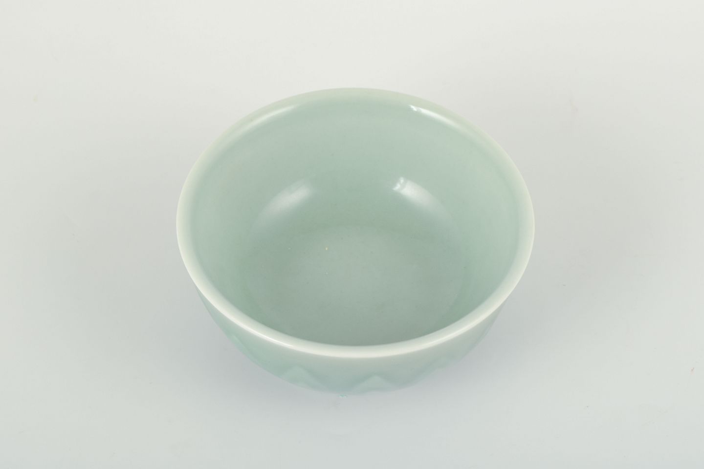 En elegant skål fra Royal Copenhagen i klassisk celadonglasur med enkel, geometrisk reliefdekoration. Celadon-glasuren har rødder i kinesisk tradition, men blev i midten af det 20. århundrede fortolket af Royal Copenhagens kunstnere i en skandinavisk modernistisk ånd.