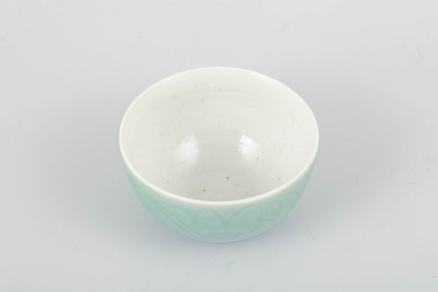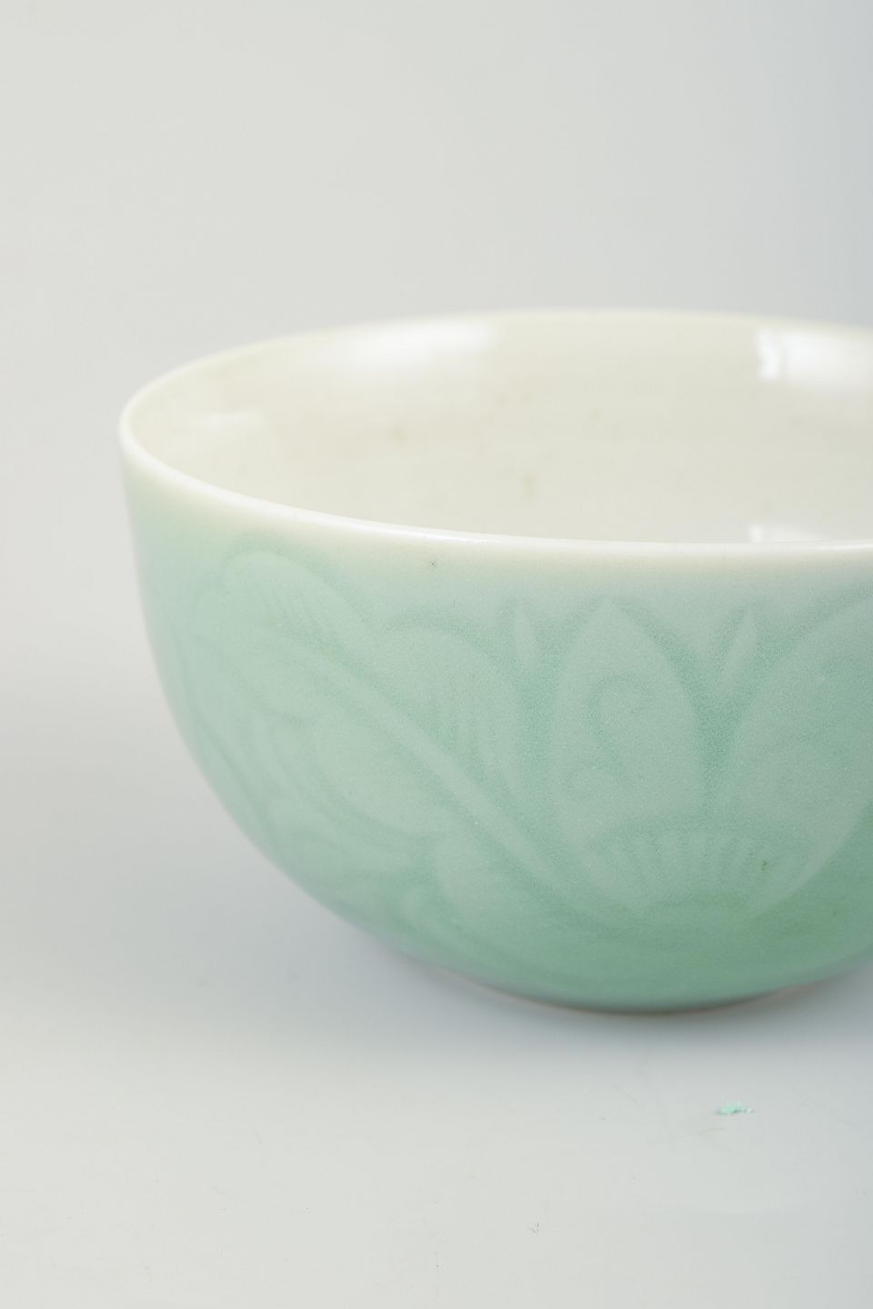 Lille skål i celadon glasur med reliefdekoration af stiliserede blade.