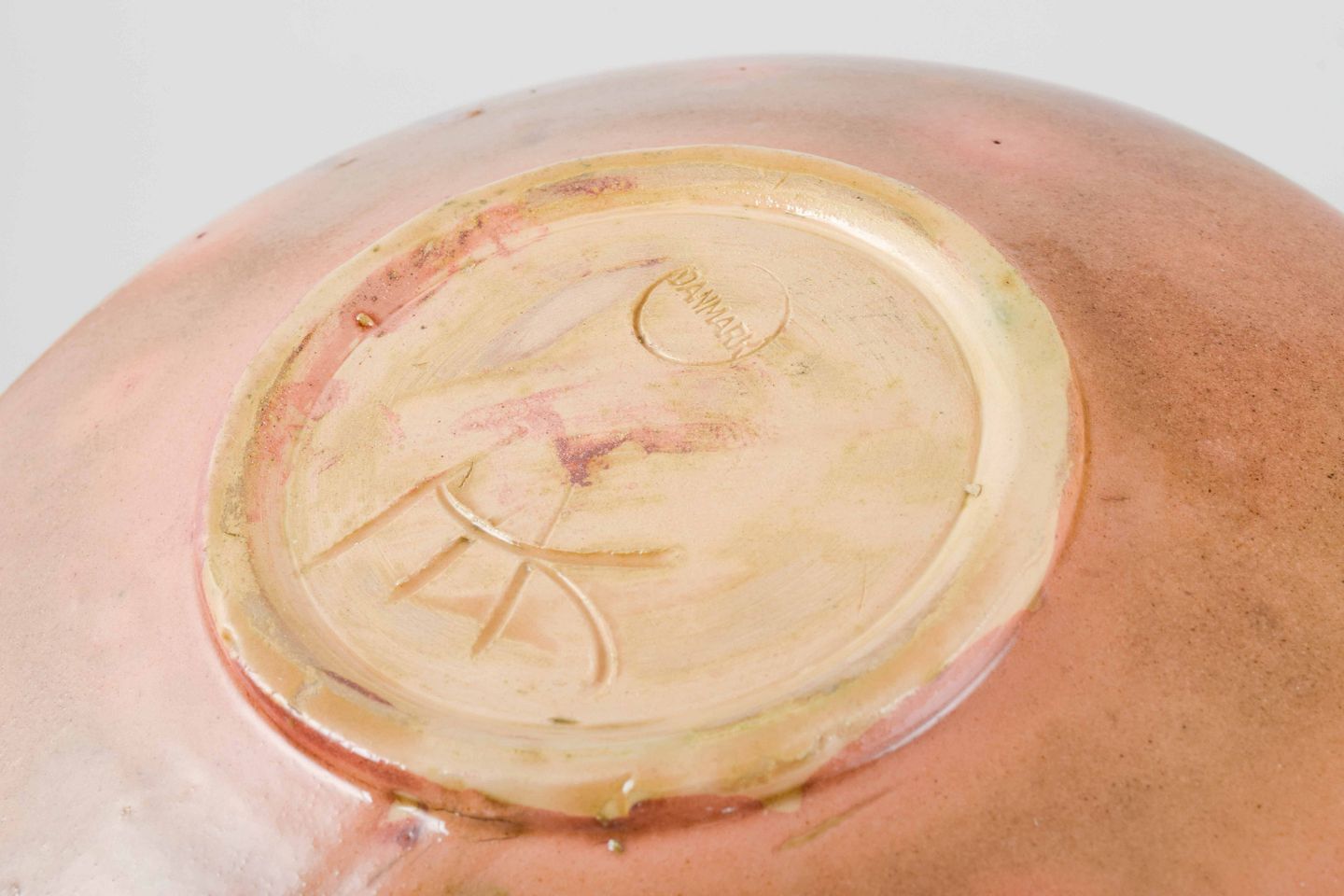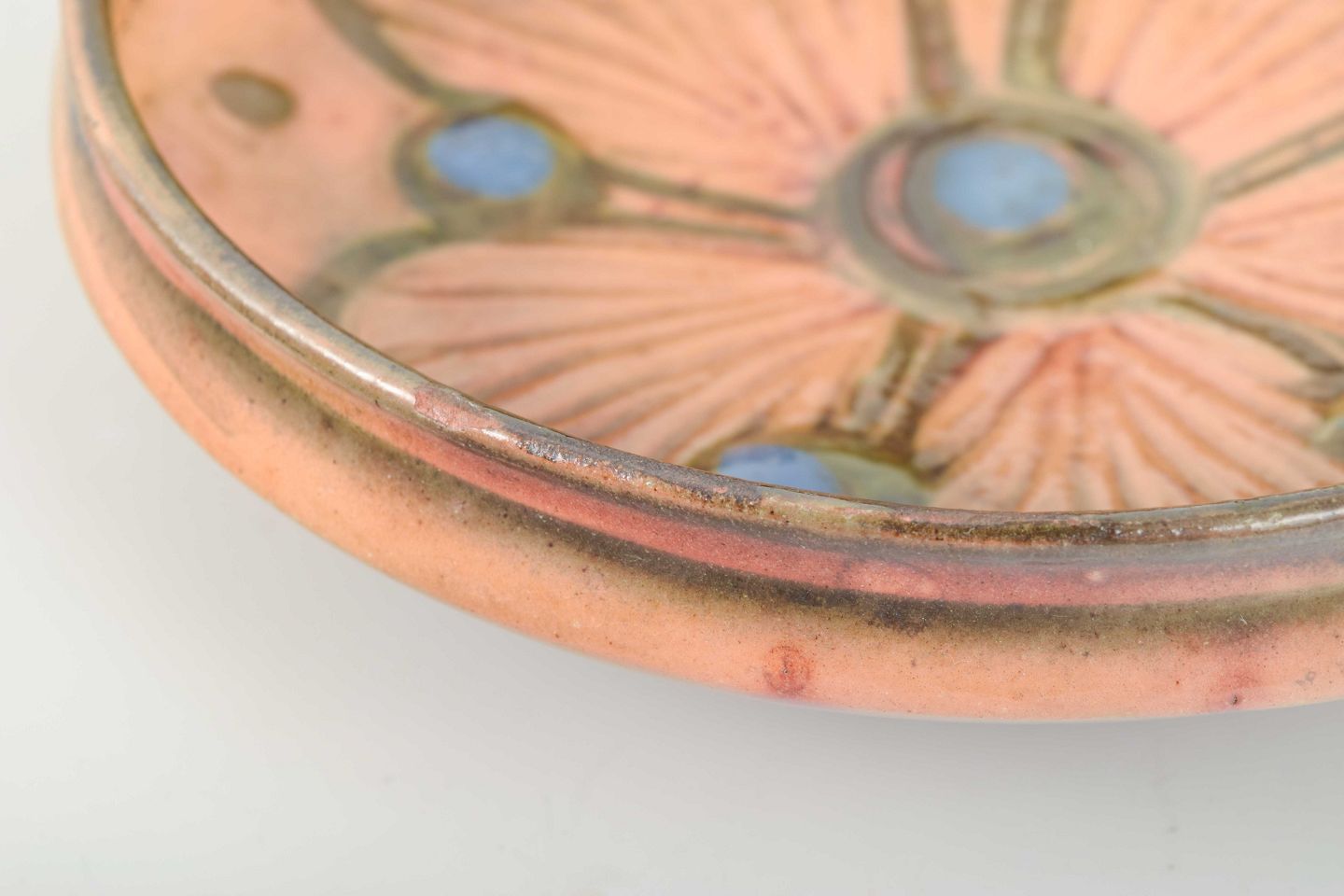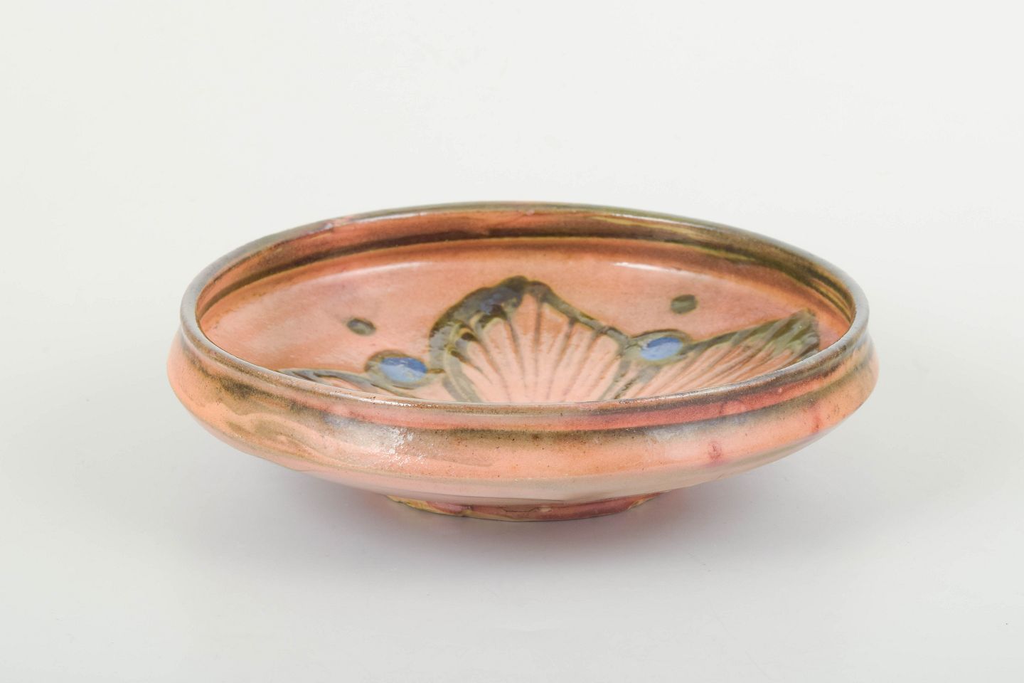 Lille skål/fad i rosa kohorn-glasur med håndmalet blomstermotiv i grøn og blå dekoration.