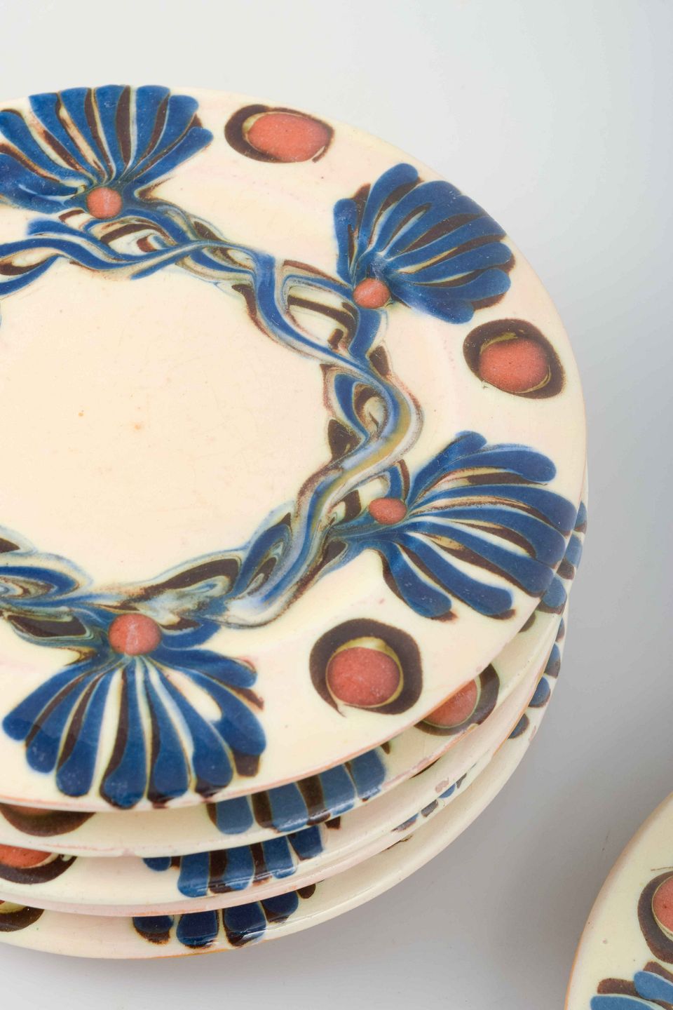 Seks små tallerkner i Marguerite-stellet, glaseret keramik hånddekoreret med polykrome blå bladranker og røde frugtmotiver på lys bund.
