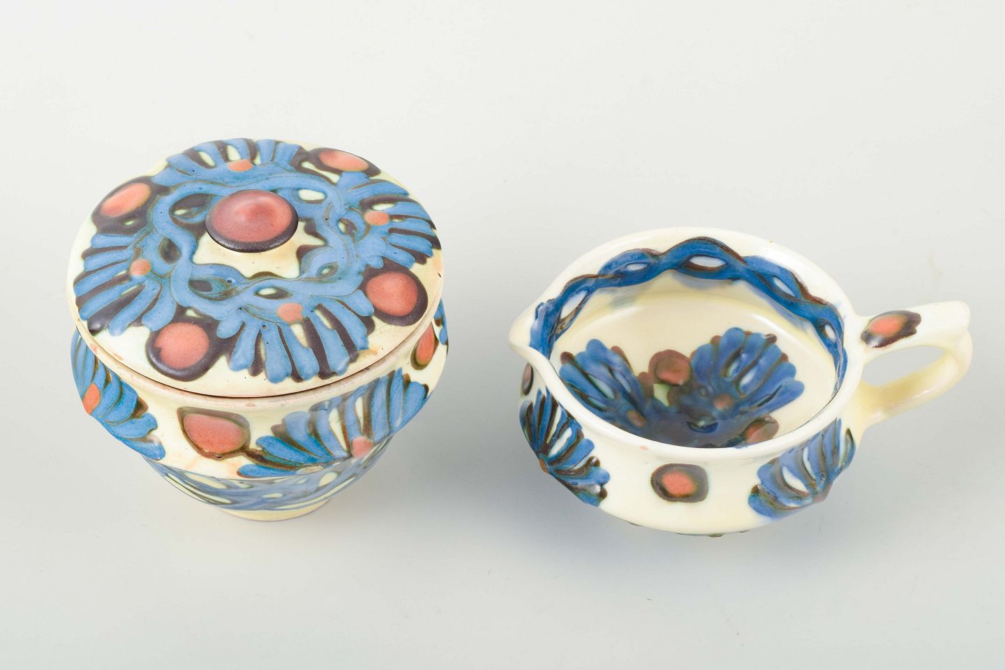 Et dekorativt sæt bestående af flødekande og sukkerskål fra Kählers berømte Marguerite-stel, hvor traditionelle former og farver forenes i et udtryk, der kombinerer brugskunst med dekorativ folkekunst.