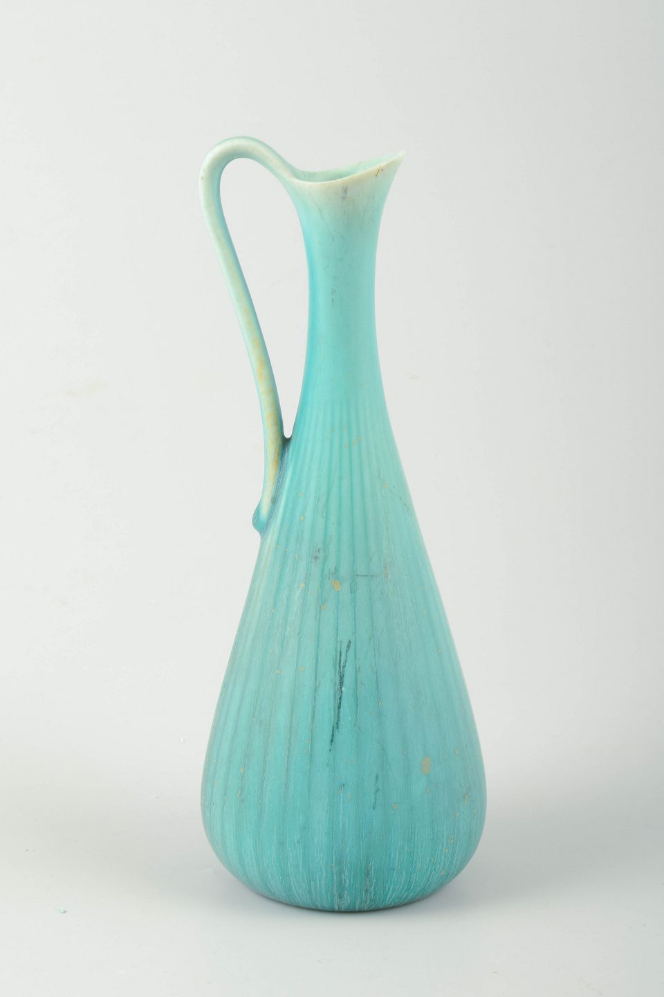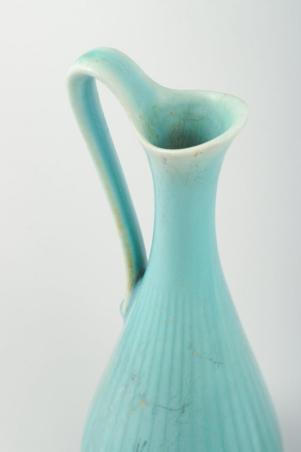 En klassisk skandinavisk kande af Gunnar Nylund for Rörstrand, udført i 1950’erne med den karakteristiske matte turkisblå glasur og en elegant form, der forener funktionalitet og dekorativ modernisme.
