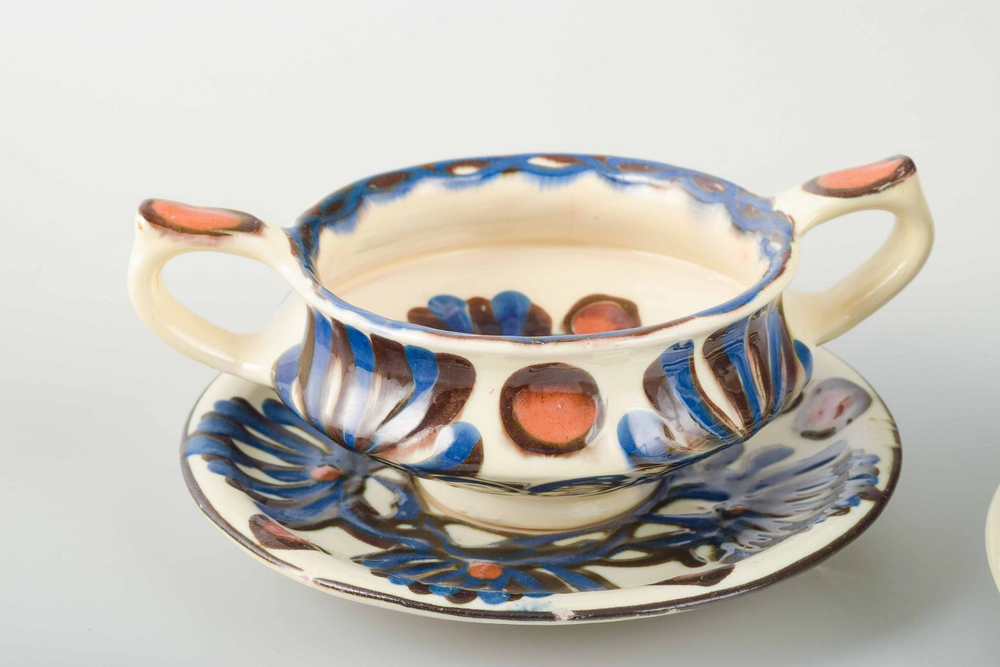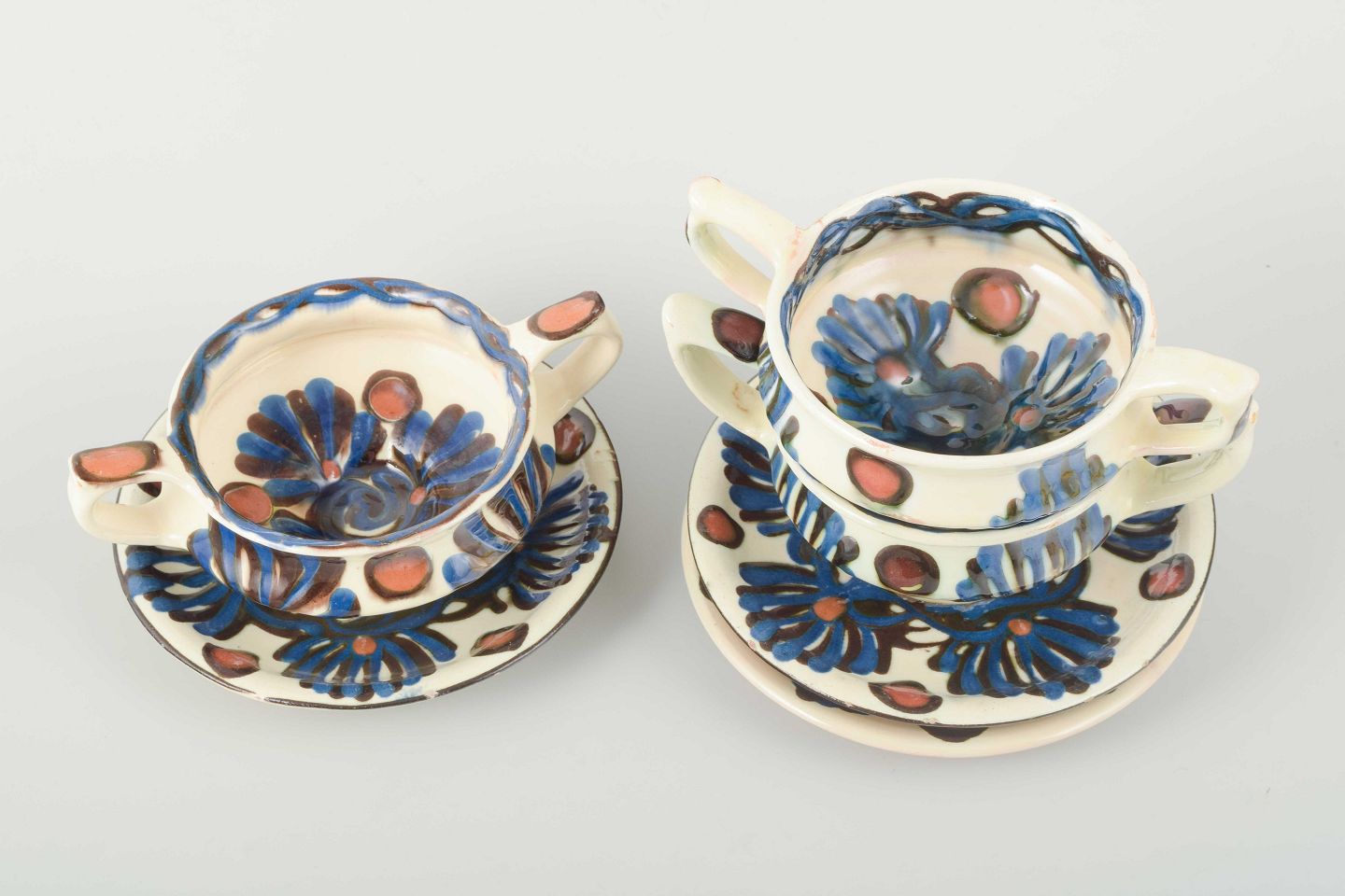 Three bouillon cups with matching saucers, glazed ceramics hand-decorated with polychrome floral motifs in blue, brown, and red glaze on a light ground.
