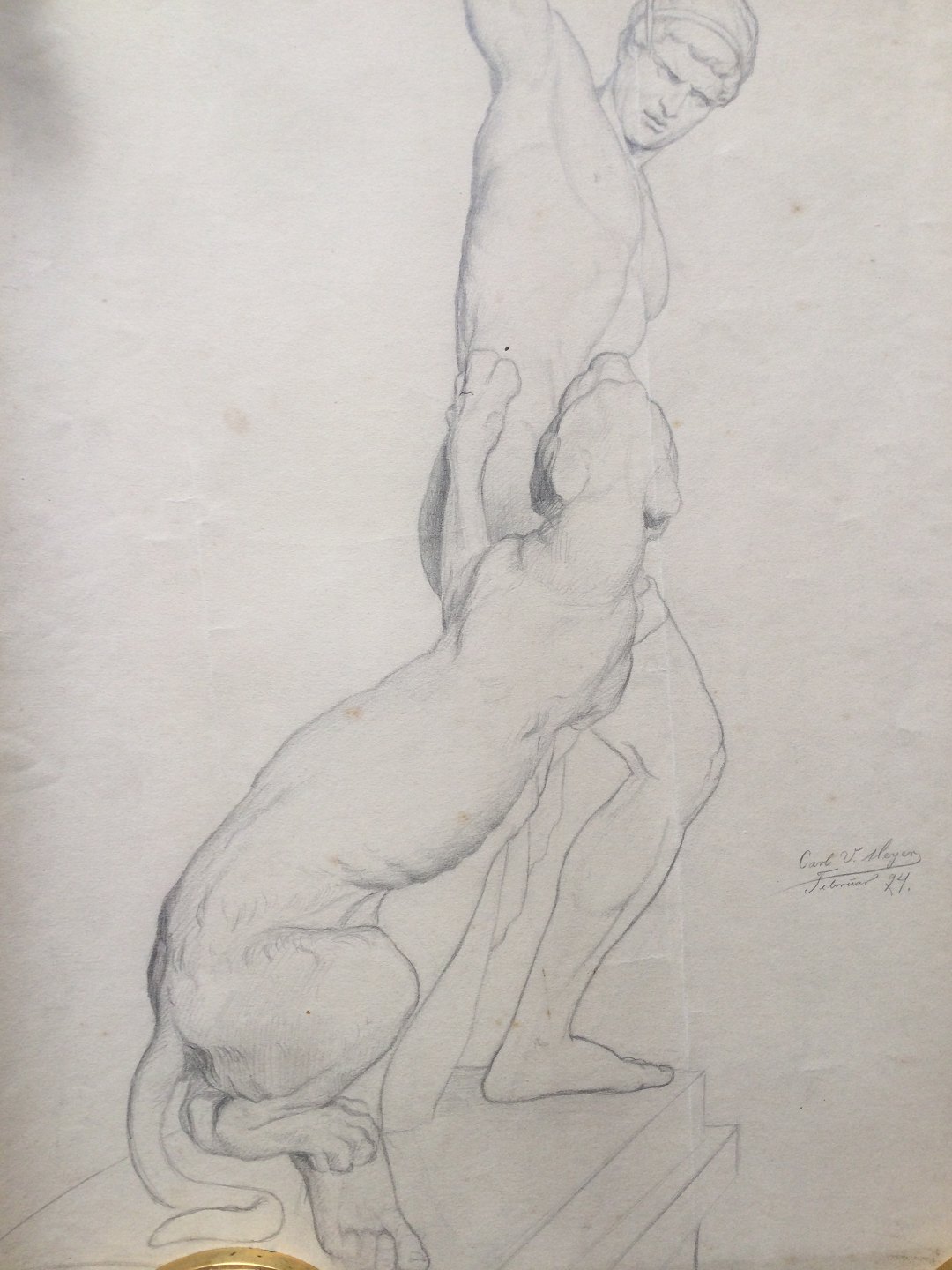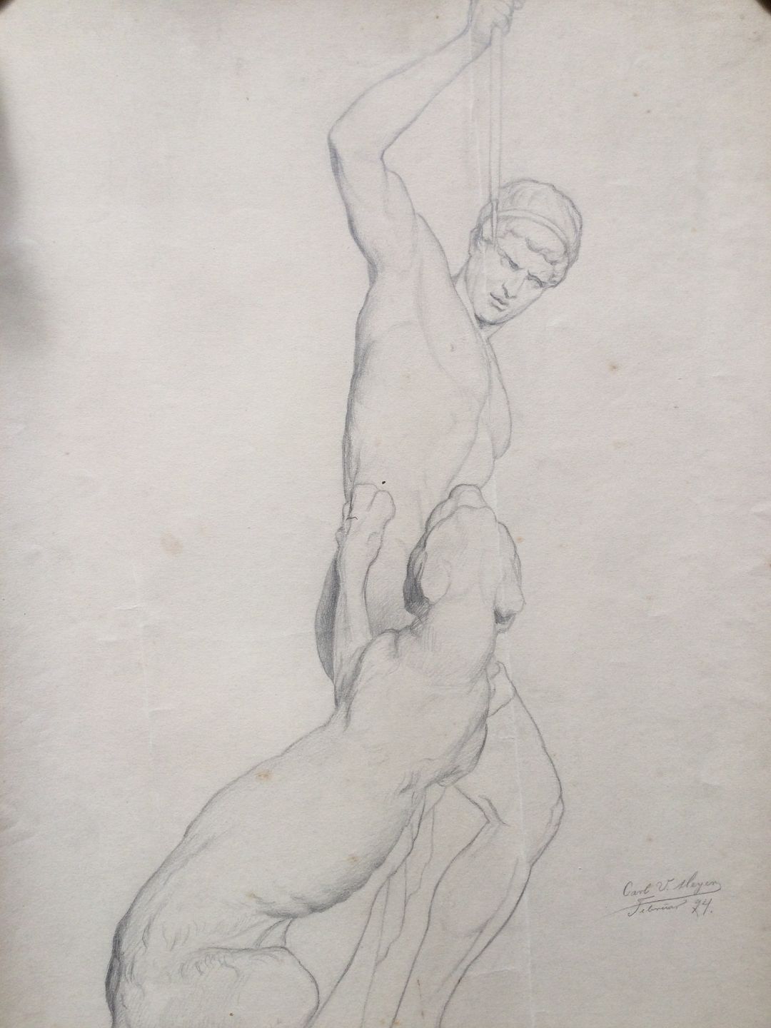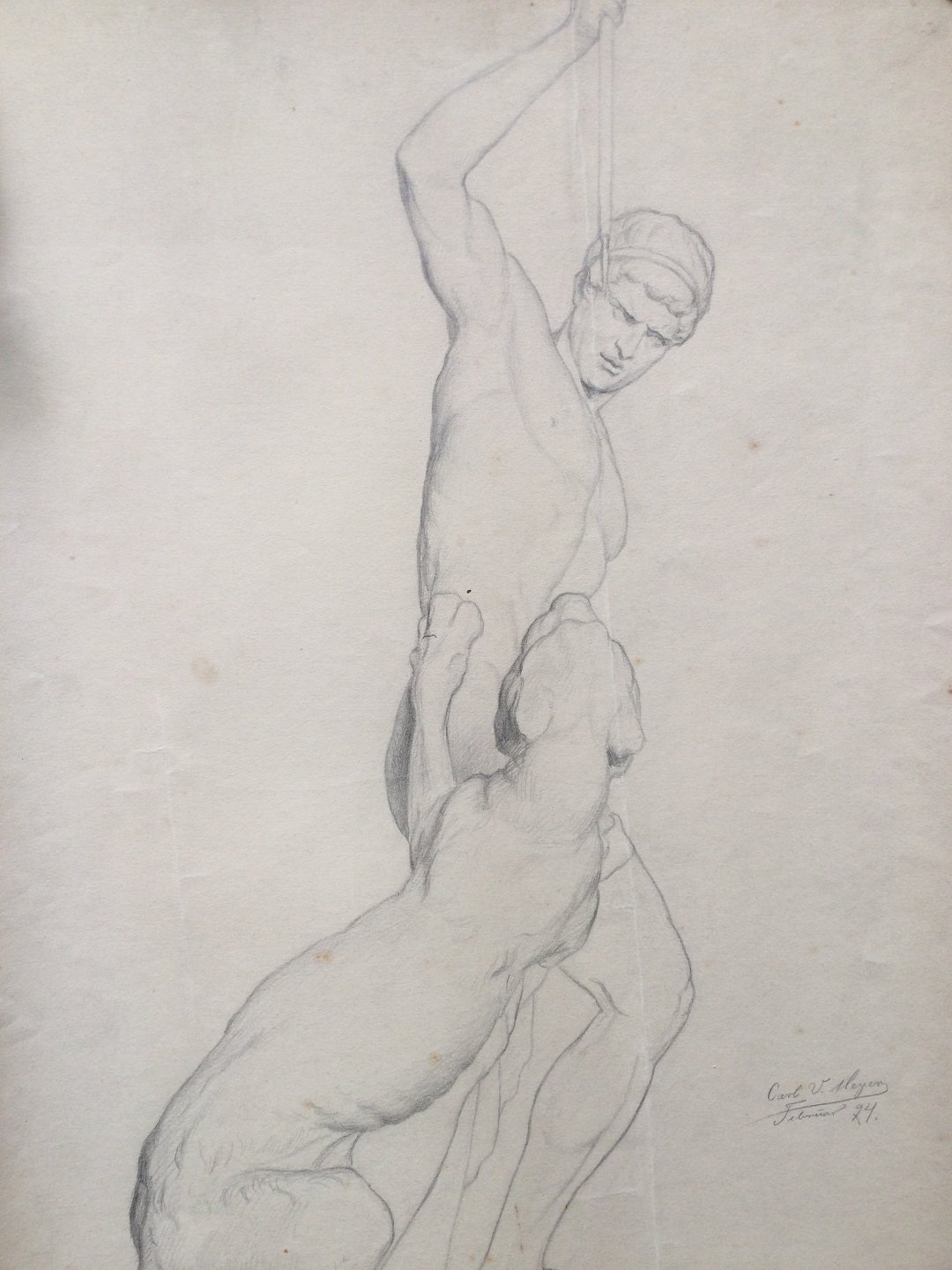 Akademitegning af Carl V. Meyer 1894 - Skulptur nøgen mand - Panterjægeren.