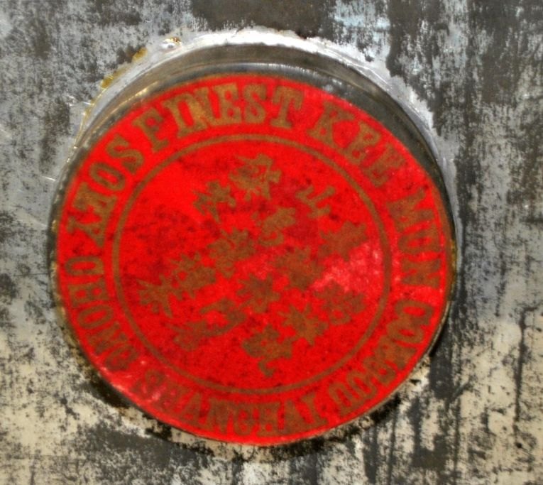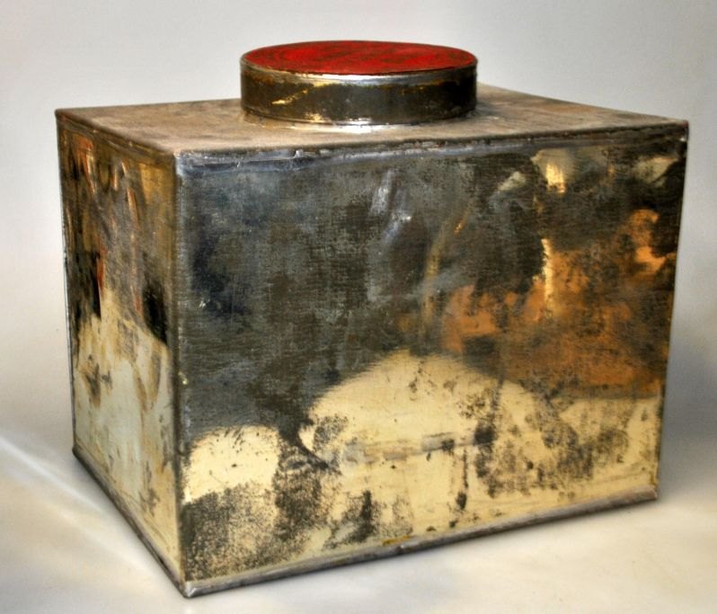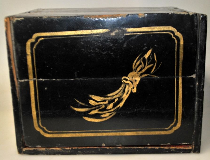 Antik bemalet trææske til te, Kina, 19. årh. Sortlakeret træ med dekorationer og tekst. 24 x 21 x 18 cm. Indvendig metal beholder med låg med tekst.