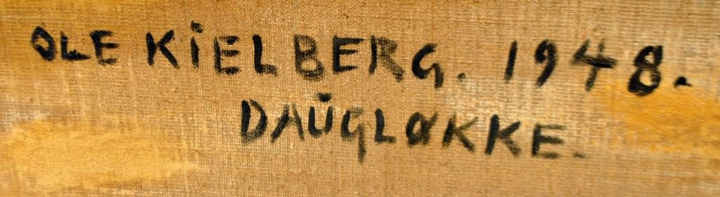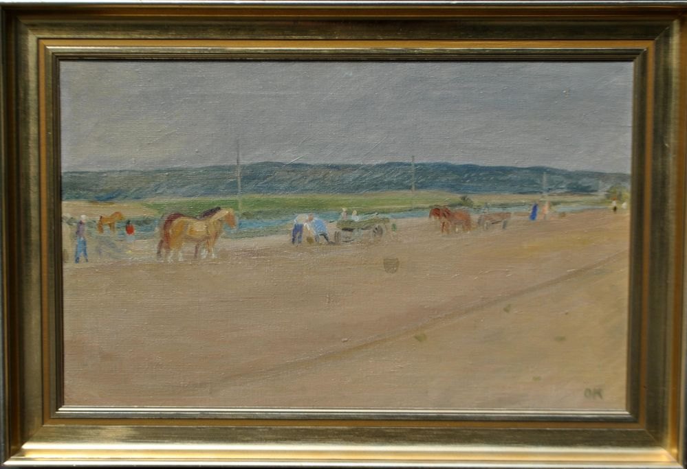 Kielberg, Ole (1911 - 1985) Denmark: Ploughing, 1948. Oil on canvas. Signed: OK and on the back: Ole Kielberg Daugløkke 1948. H: 38 cm. W: 61 cm.