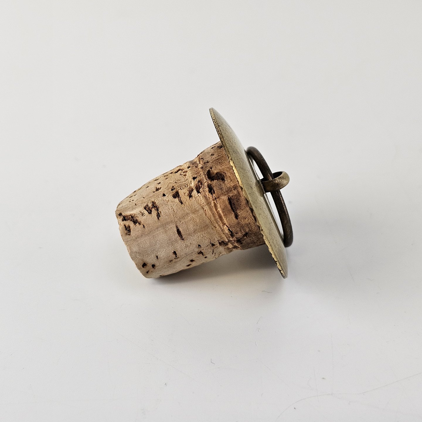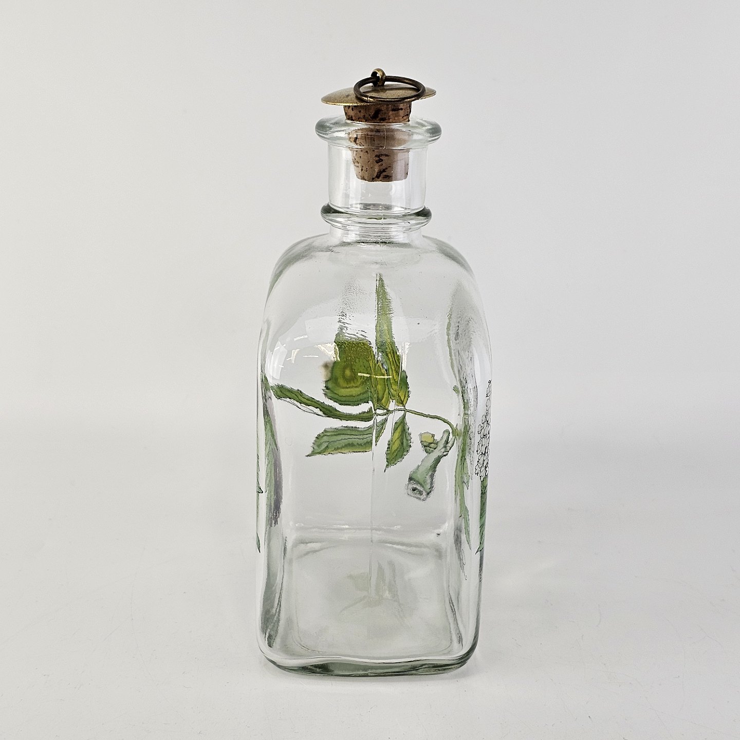 Karaffel i klart glas med korkprop fra serien Brændevins Amatøren, dekoreret med en gren af hyldeblomst og teksten Sambucus Nigra L.