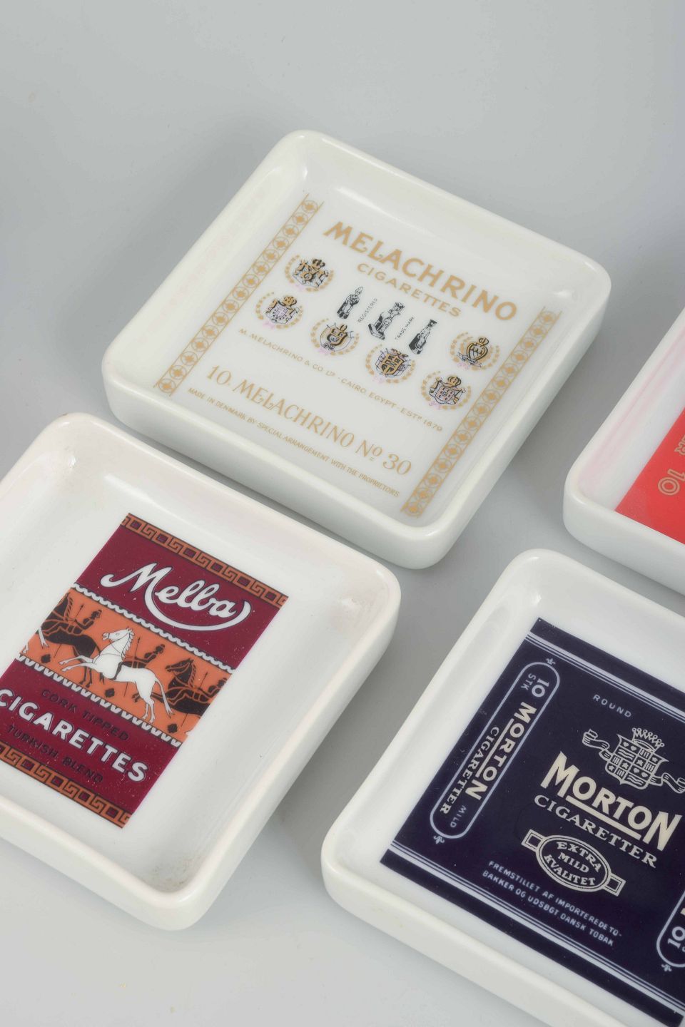 Sæt med fire kvadratiske porcelænsaskebægre, hver dekoreret med klassiske tobaks- og cigarmotiver. Leveres i originale æsker.
