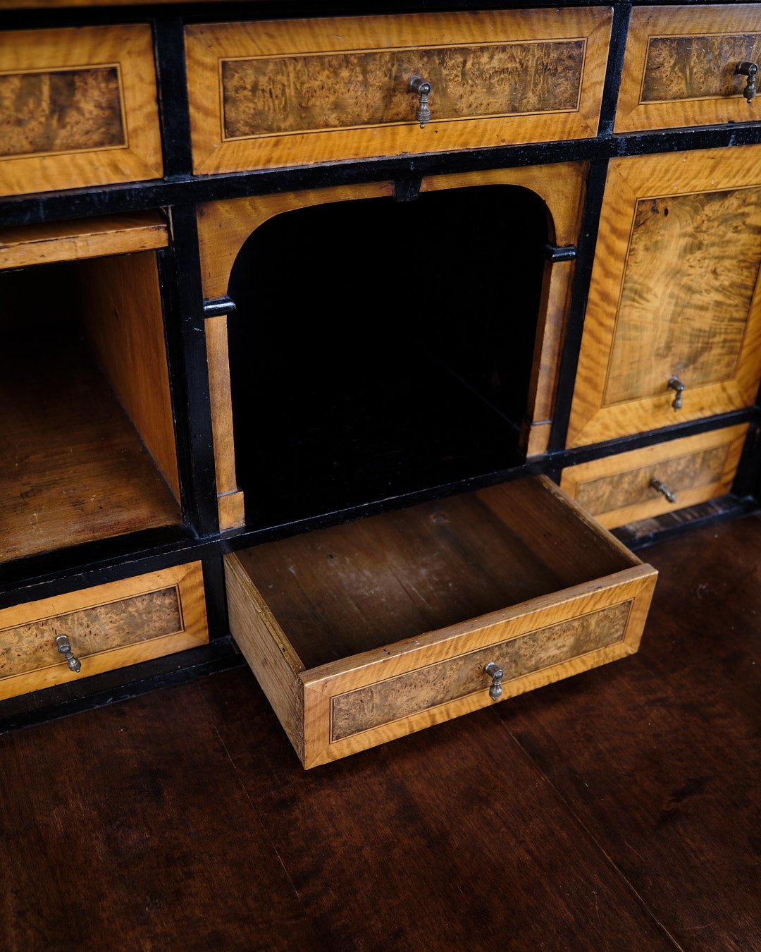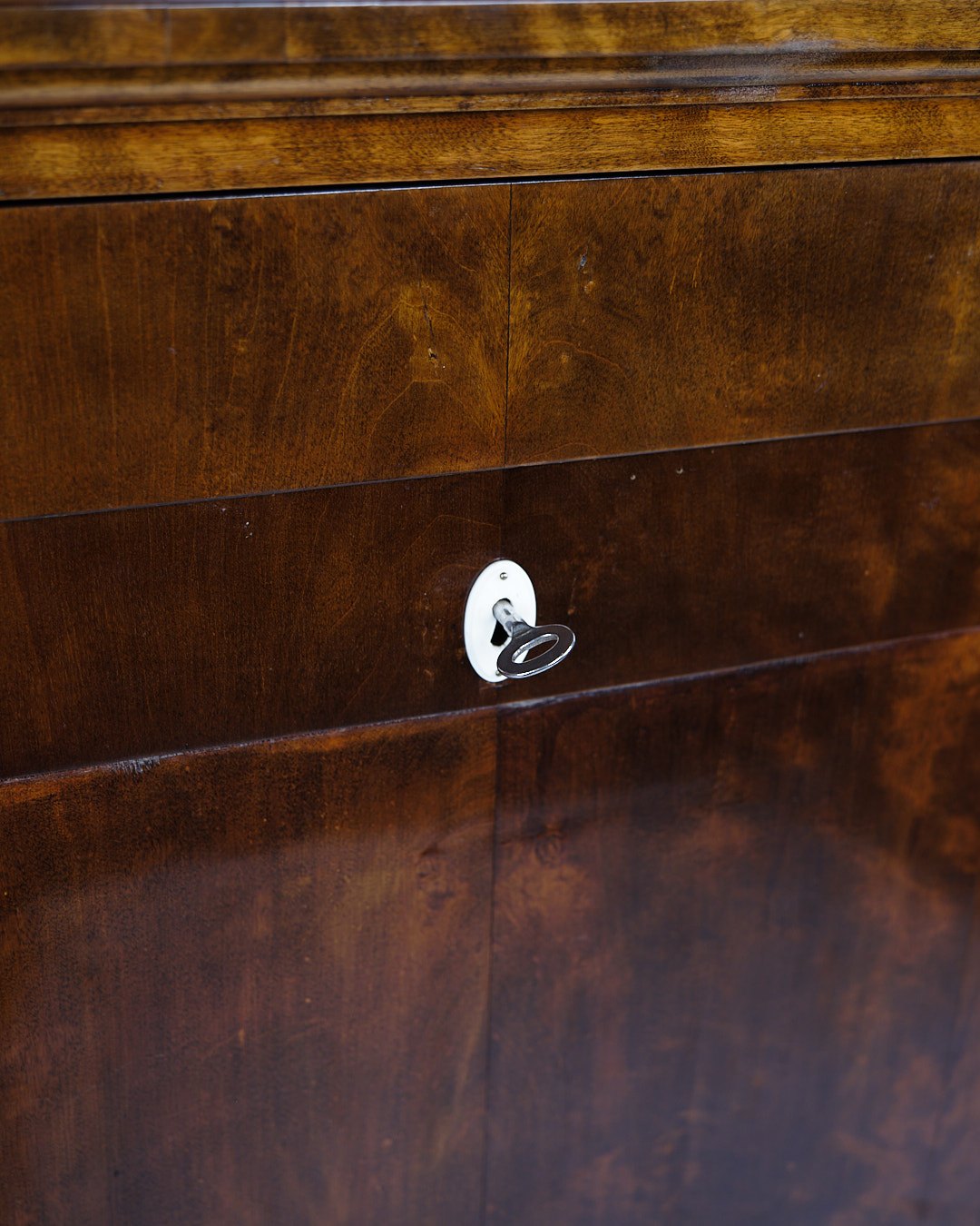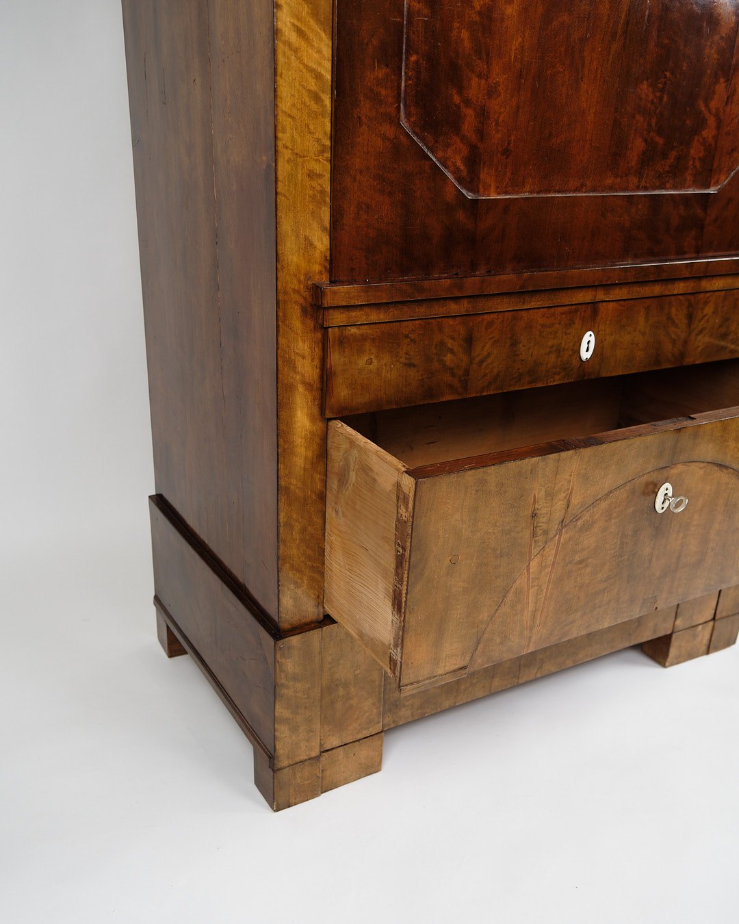 antik sekretær fra 1840’erne, udført i håndpoleret birketræ med smukke intarsia-detaljer. Møblet er indrettet med to skuffer og fremstår som et fint eksempel på 1800-tallets klassiske snedkerhåndværk, hvor funktionalitet og dekorativt udtryk blev forenet.