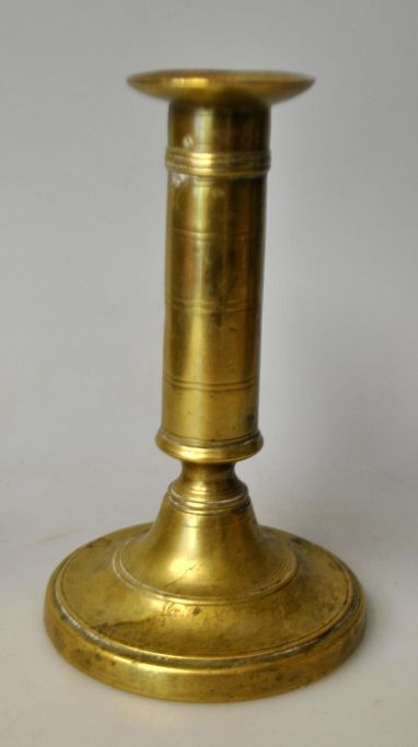 Antique Danish Empire brass candlestick, circa 1820. Round base and smooth stem. H.: 15 cm.