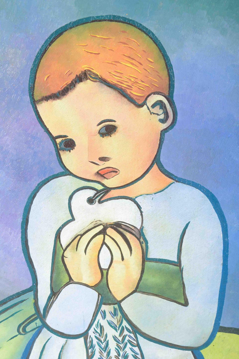 Et stemningsfuldt figurativt maleri, der viser et barn med en due i hænderne og en farverig bold i forgrunden. Kompositionen er enkel og præget af klare konturer, rolige farvefelter og en sart stemning, som fremhæver motivets stille alvor.