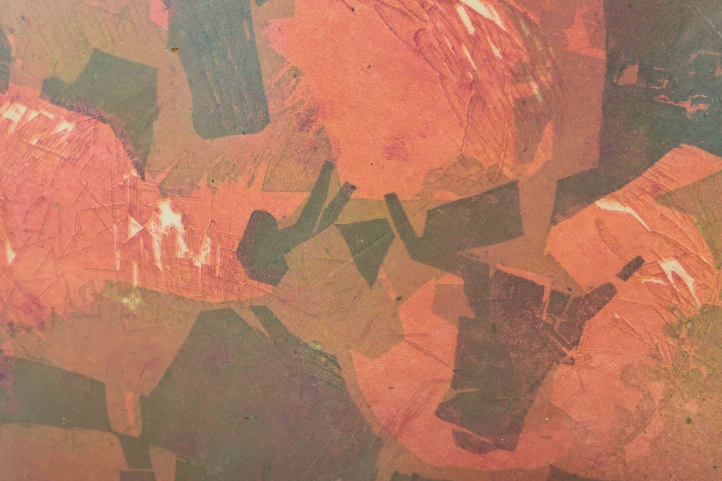 A modernist special print by Ebbe Eberhardson, executed in rust, orange, and green tones. The composition is built from overlapping, geometrically inspired forms with incised textures, creating a rhythmic and tactile quality.