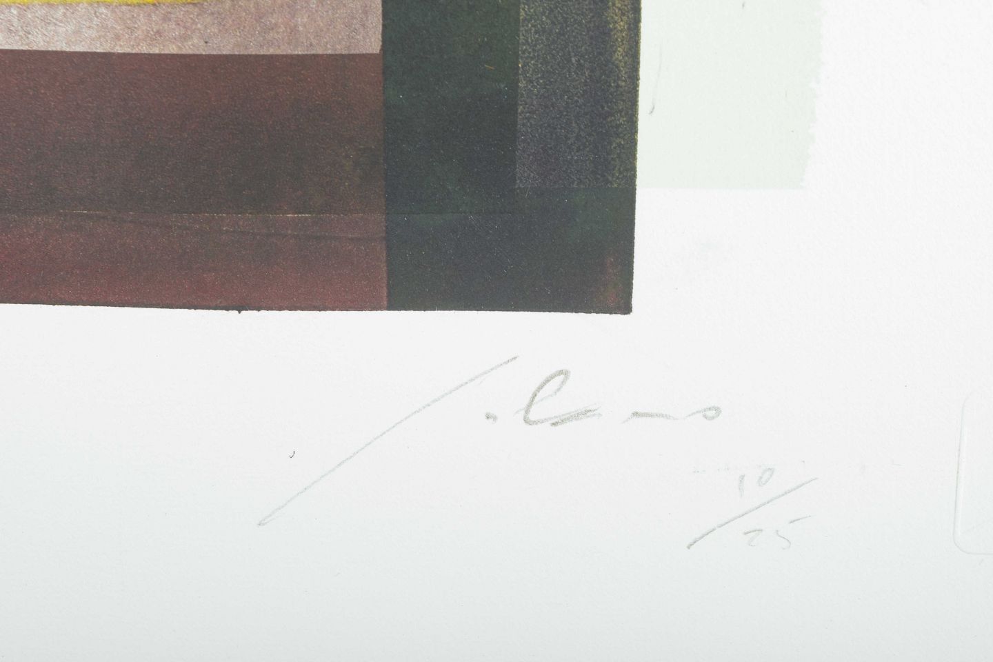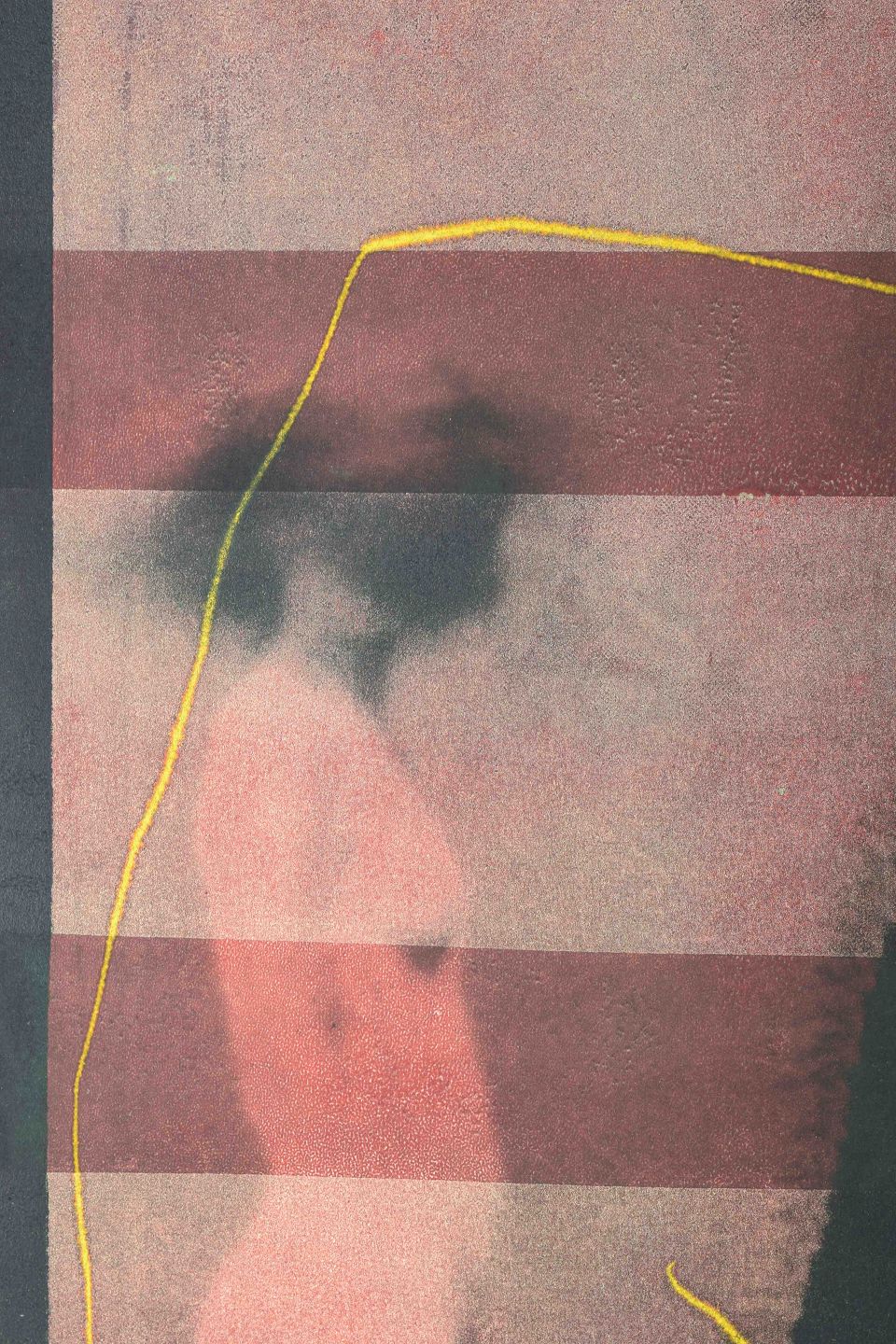 A characteristic graphic work by the Spanish-Uruguayan artist Juan Cano, combining figurative and abstract elements through layered fields and spontaneous lines. The motif depicts a stylized female figure in combination with geometric structures and expressive yellow lines, creating a strong visual contrast.
