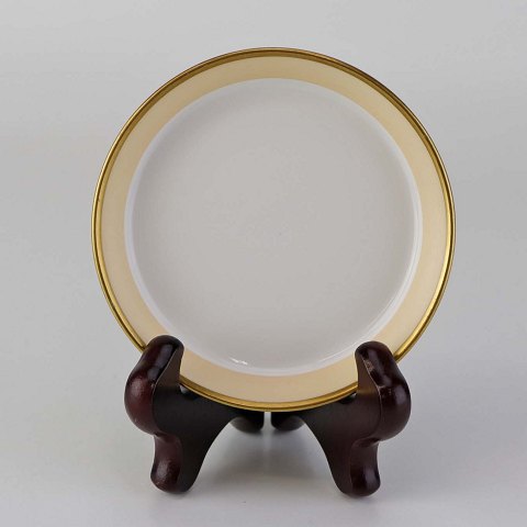 Service i glat hvid porcelæn med sandfarvet dekoration og gylden kant.