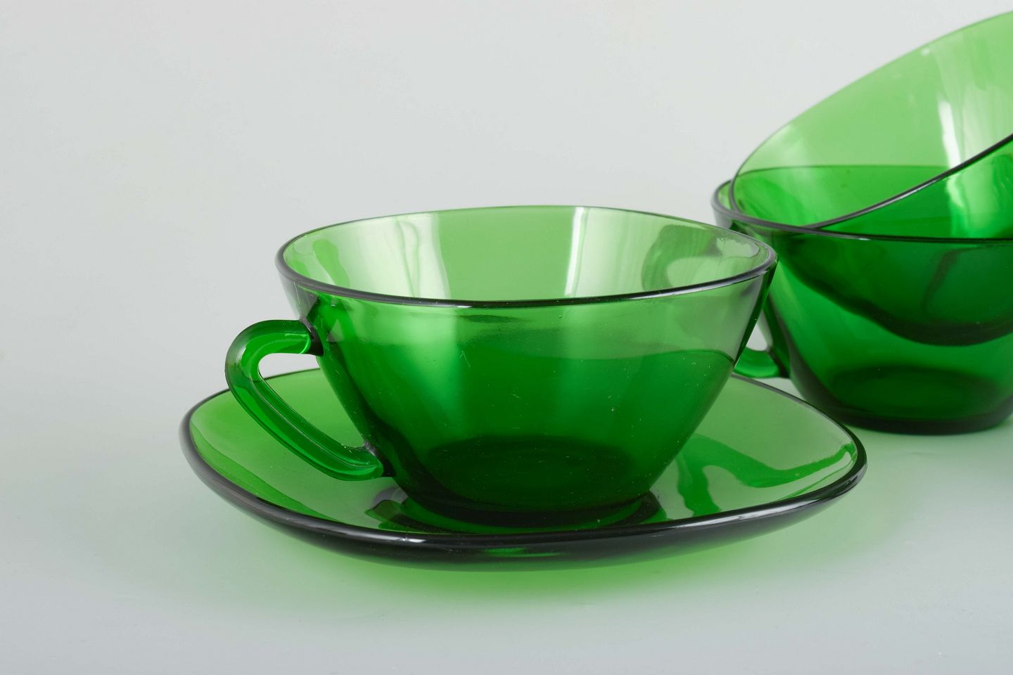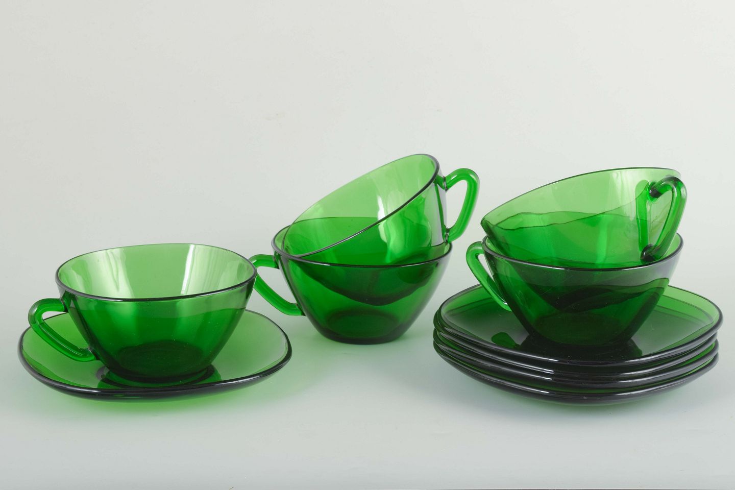 Sæt med fem grønne tekopper i presset glas med tilhørende underkopper.