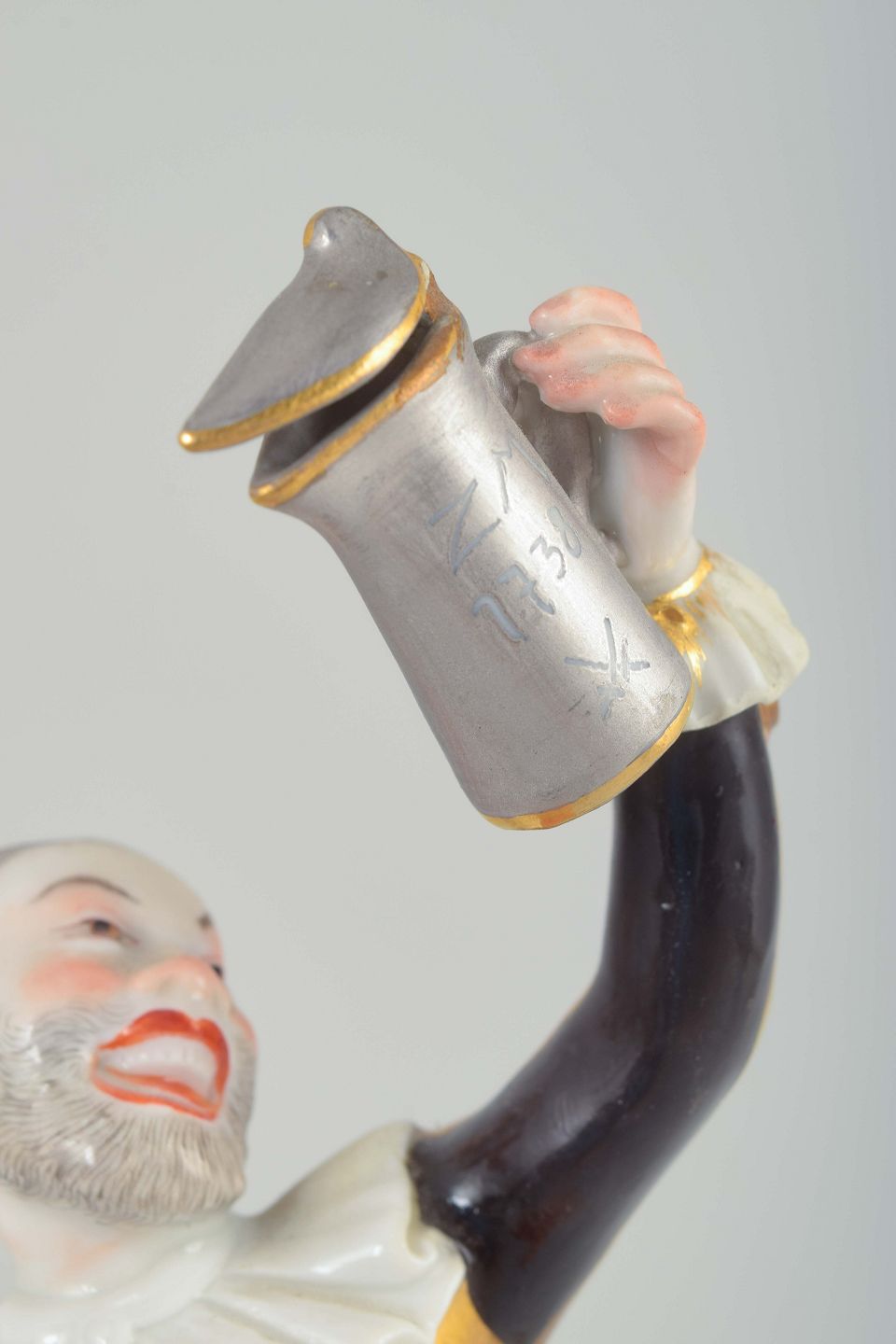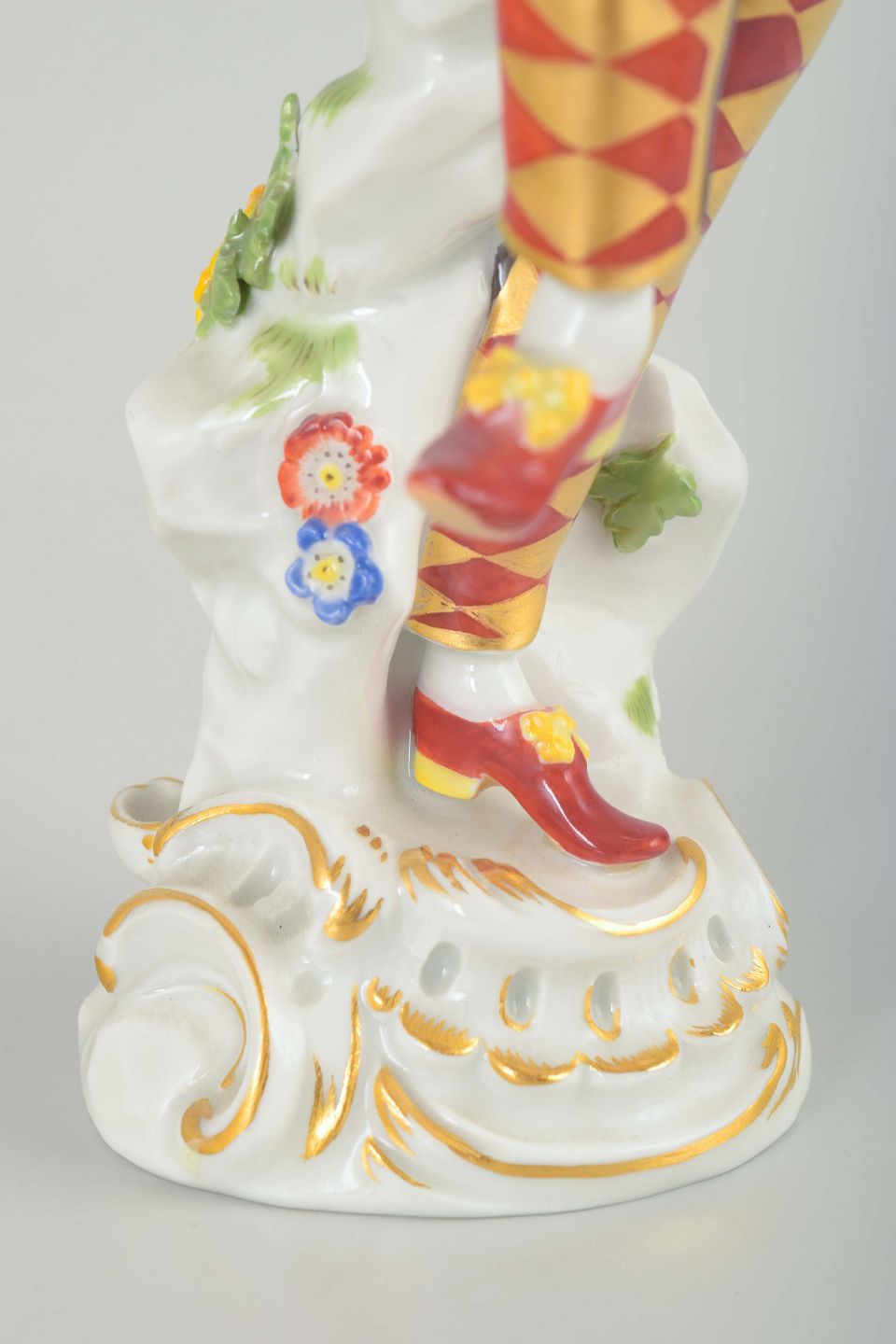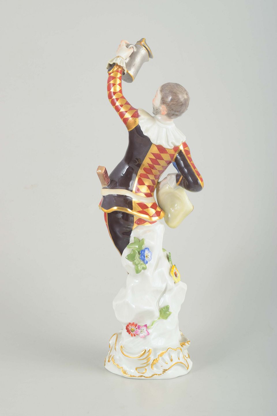Magnificent and highly detailed porcelain figure of Harlequin in a classic Commedia dell’arte costume, executed in the finest colors with lavish hand-painted decoration in red, gold, and black. The figure depicts Harlequin in a festive pose with a raised tankard, richly embellished with gilt details, and standing on a rococo-inspired base adorned with flowers.