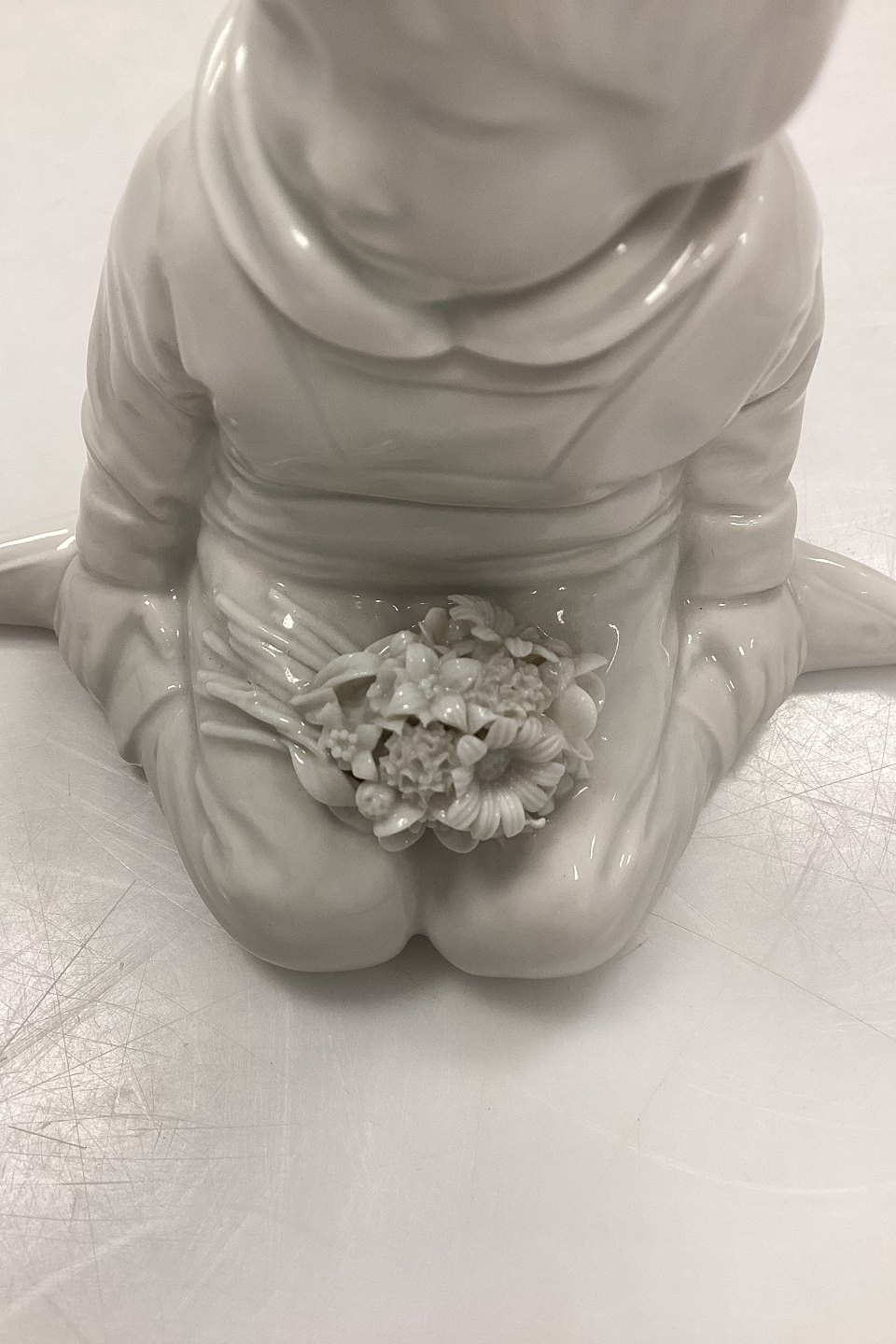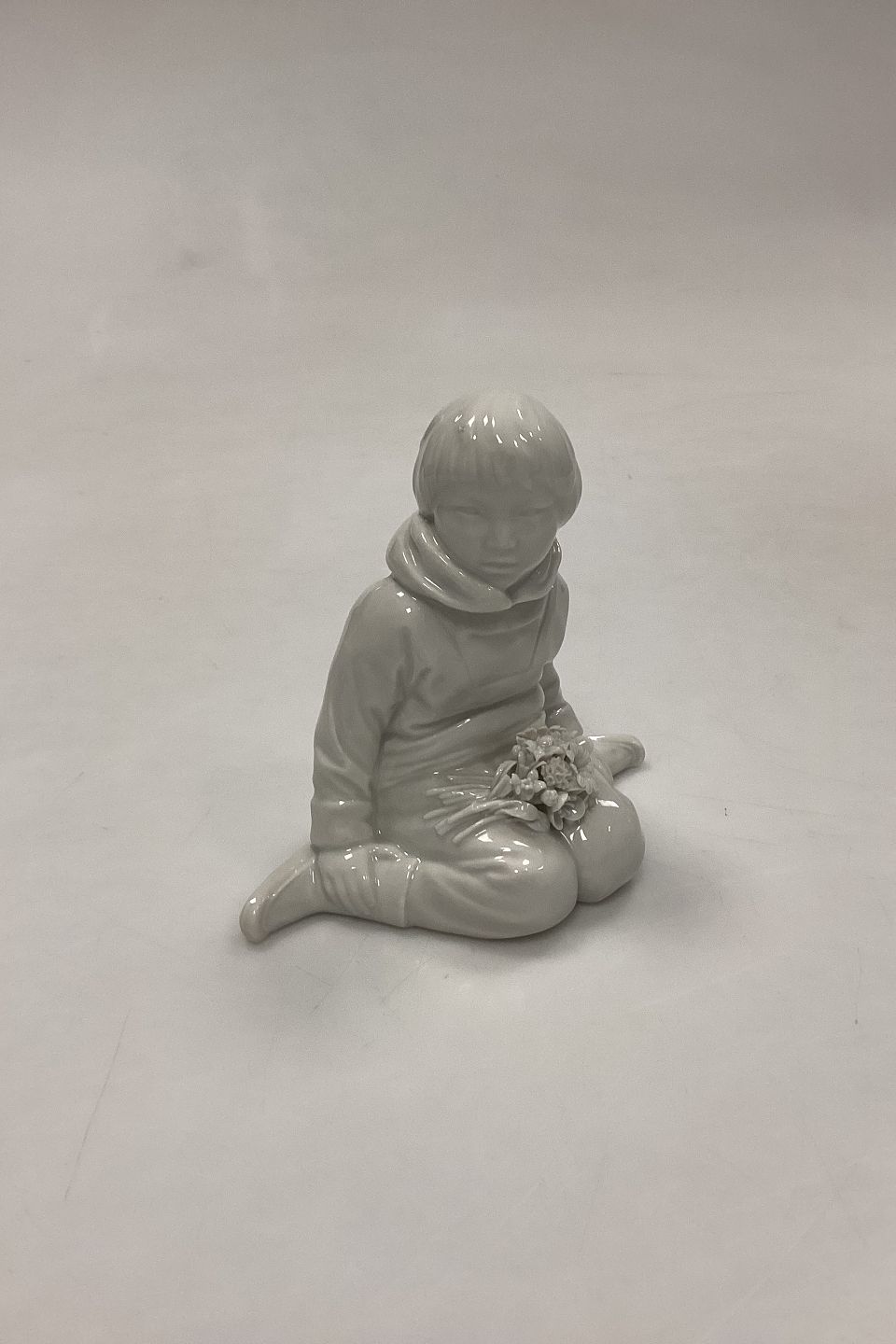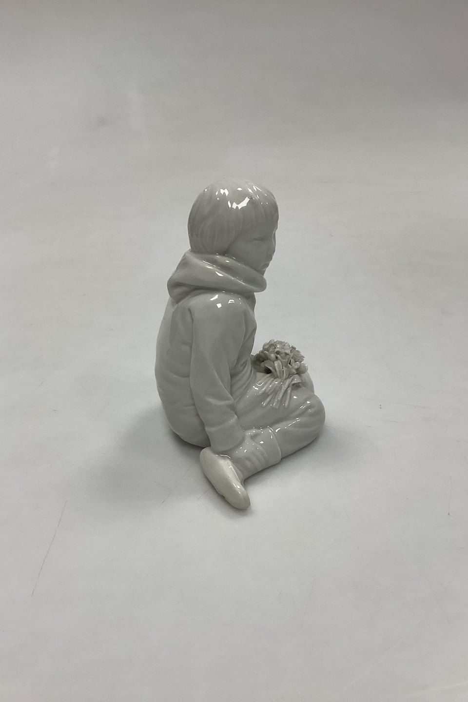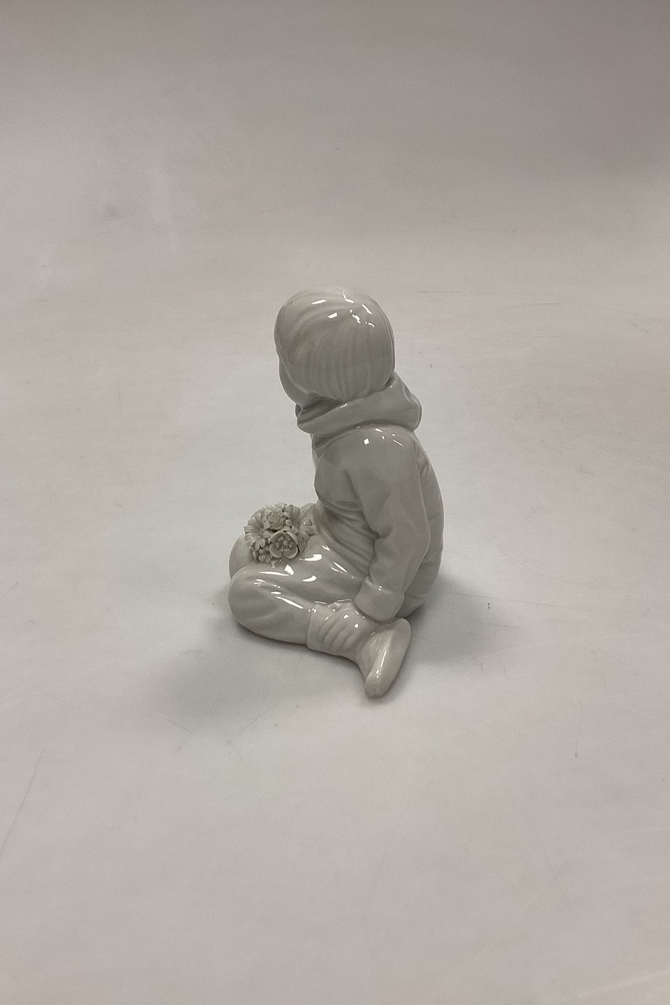 Royal Copenhagen Blanc de Chine Figurine - Boy with Flowers from Greenland No. 12419. Designed by Carl Martin-Hansen. A few minor chips on flowers. Measures 9.5 cm / 3.74 in. 1st Quality