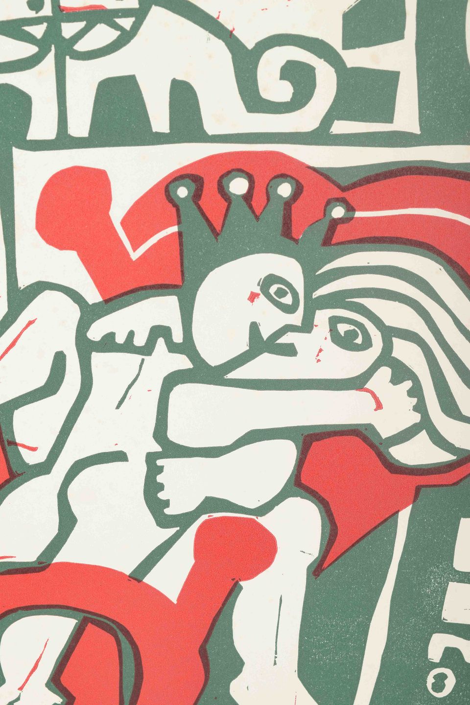 Et ekspressivt og fabulerende værk med tydelig grafisk kraft, hvor figurer, arkitektoniske elementer og tekst smelter sammen i en stærk visuel fortælling. Motivet balancerer mellem det humoristiske og det samfundskommenterende med budskabet “2 voksne 1 verden / 1 barn 2 verdener”.