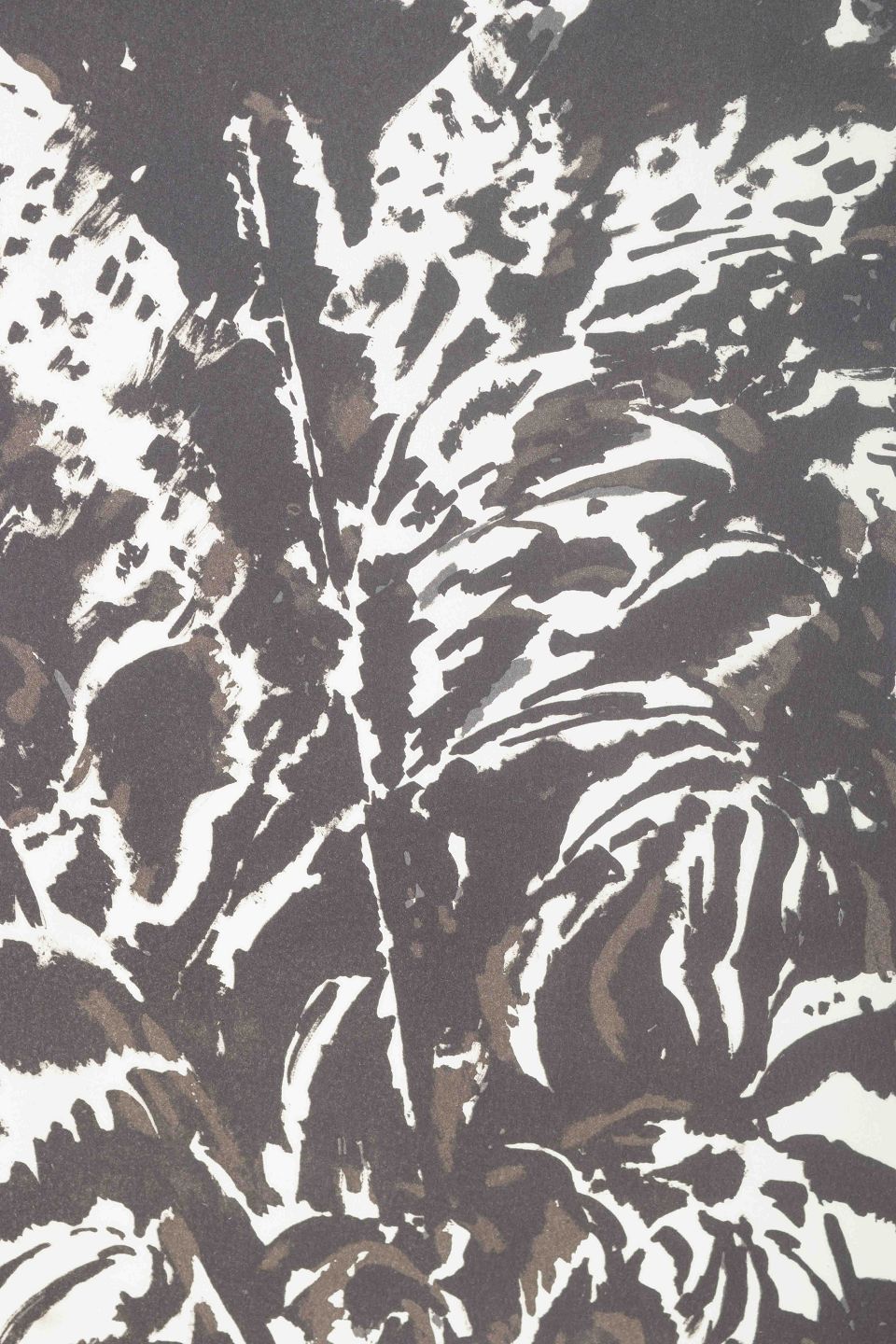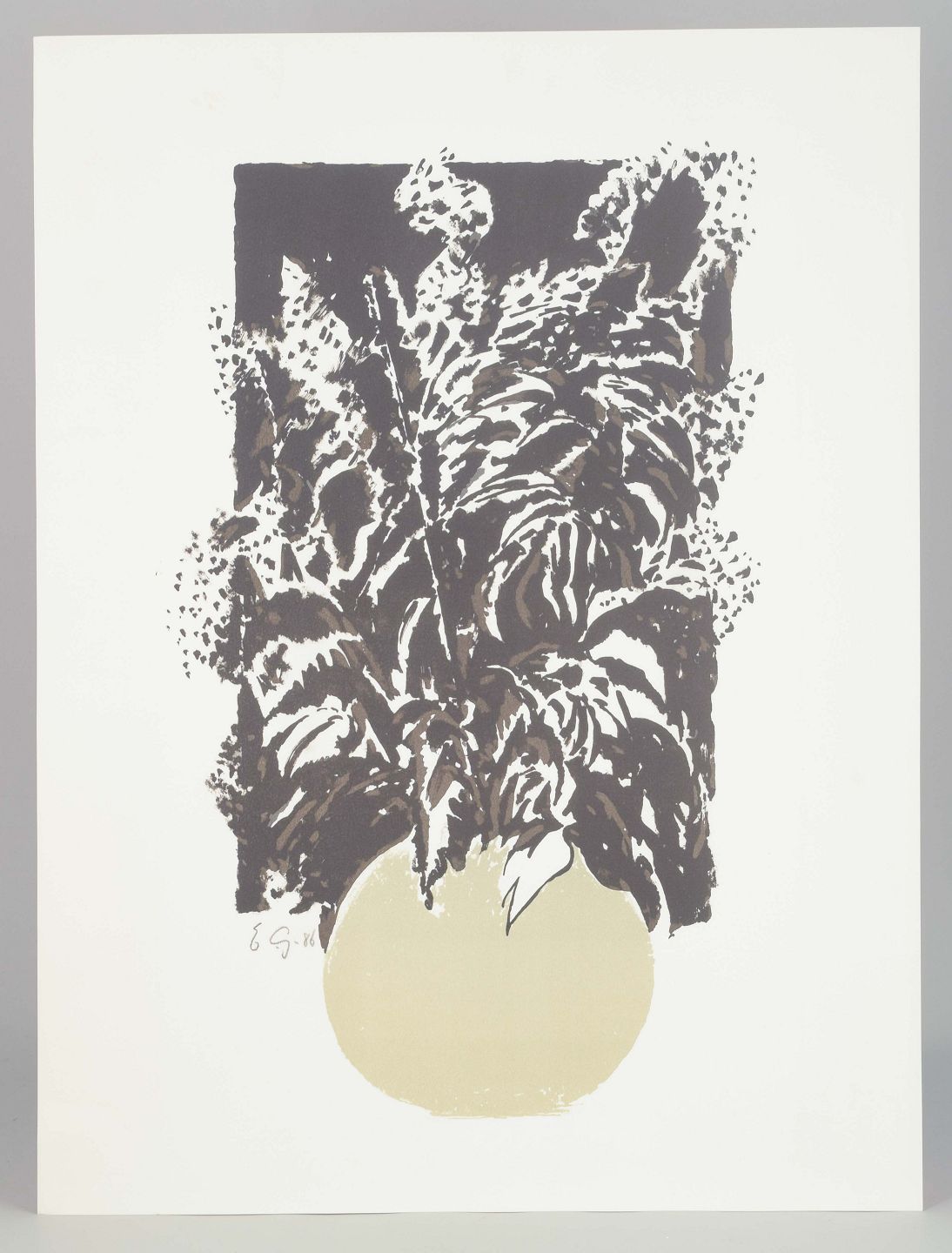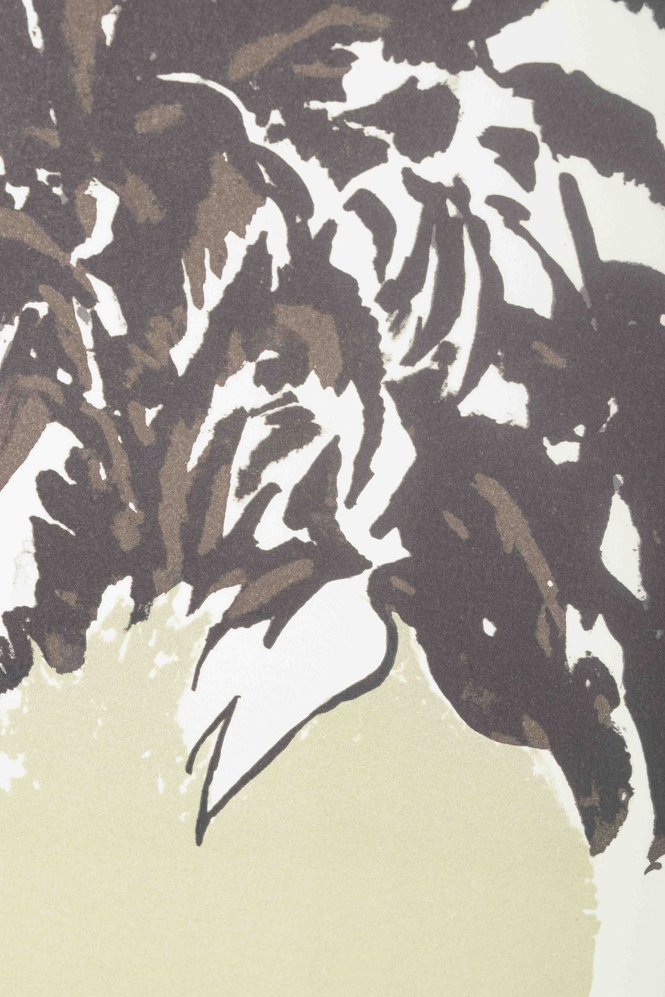 Depiction of a stylized plant in a round vase, executed in muted earth tones and contrasting surfaces. A decorative and harmonious work where the graphic rendering of the leaves creates a lively interplay of light and shadow.