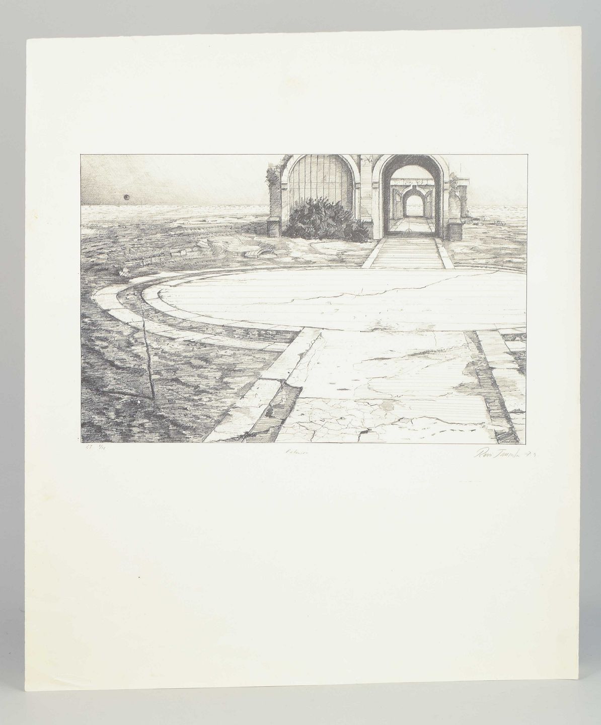 Et detaljeret og stemningsfuldt værk med et arkitektonisk motiv, hvor buede porte og forfaldne stier fører blikket ind i dybden. De fine stregtegninger skaber en næsten drømmeagtig atmosfære, der balancerer mellem virkelighed og fantasi.