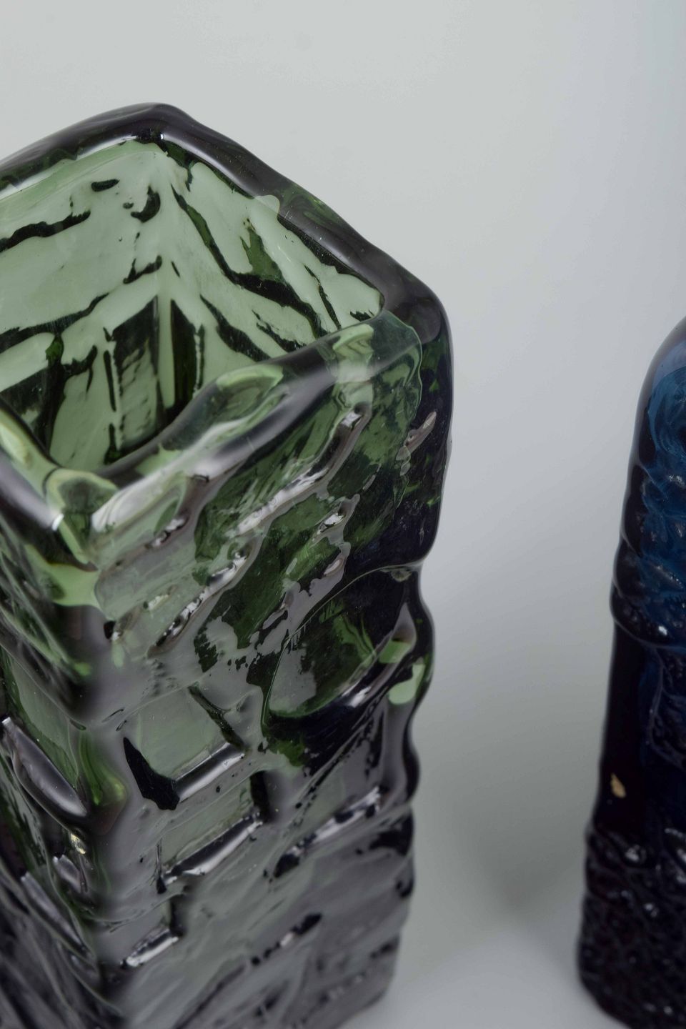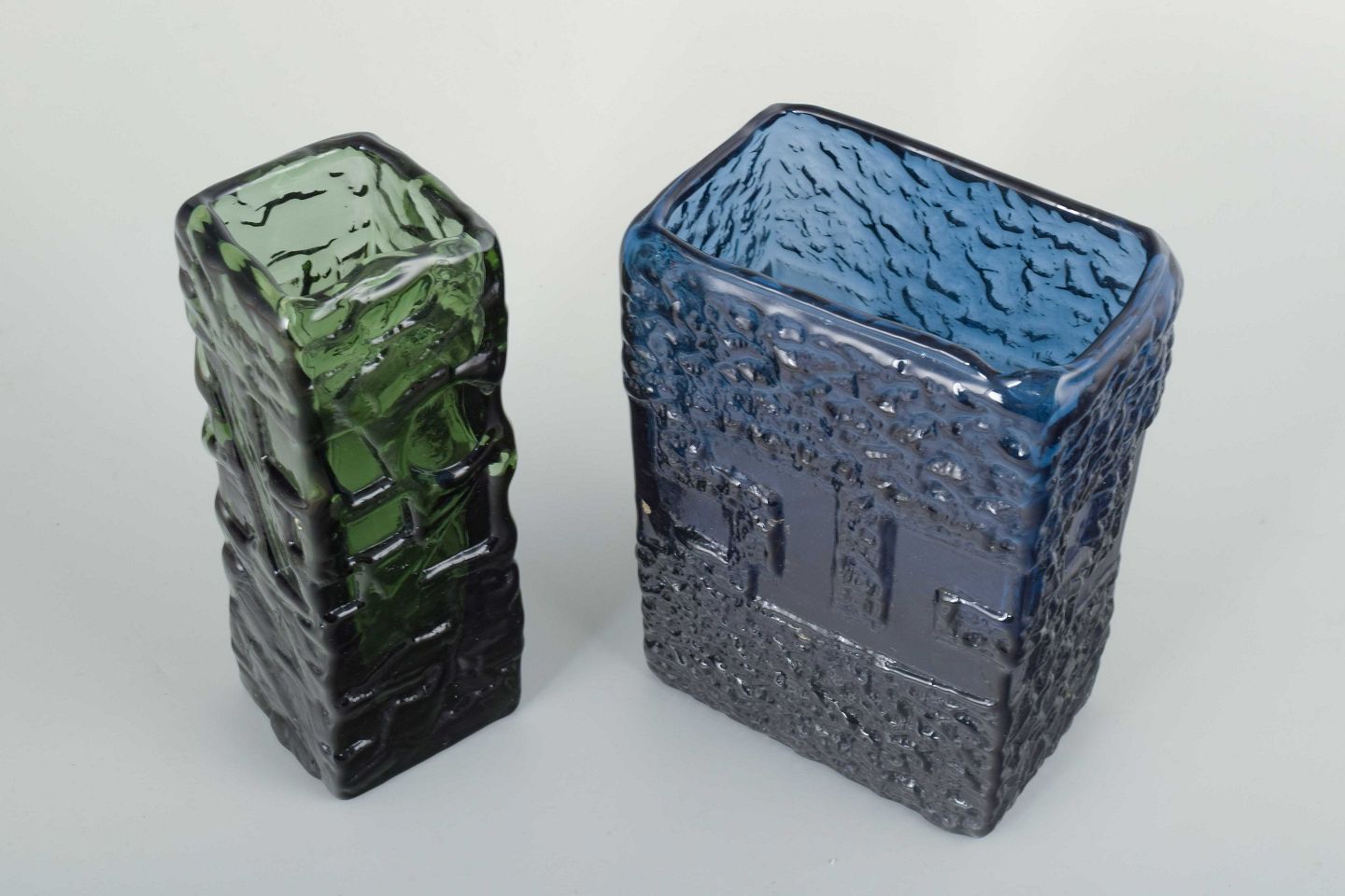 Rectangular vases in textured pressed glass, one in green and one in blue. Both with characteristic relief pattern and organic expression.