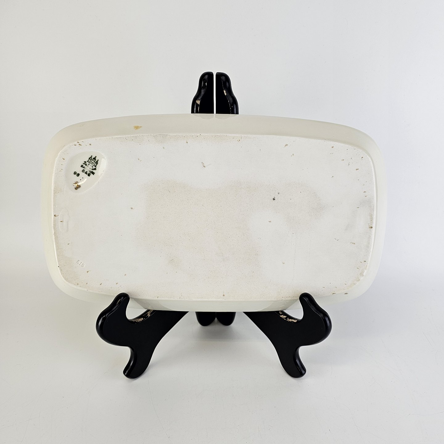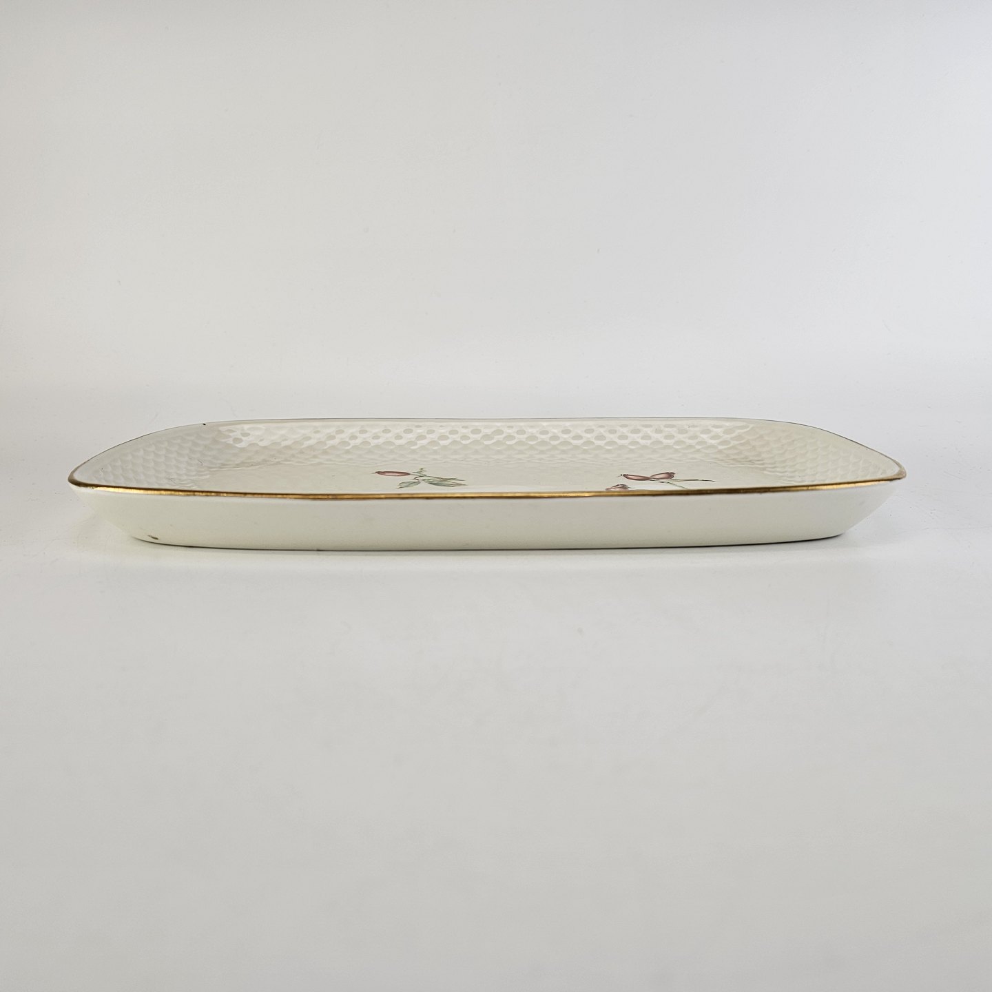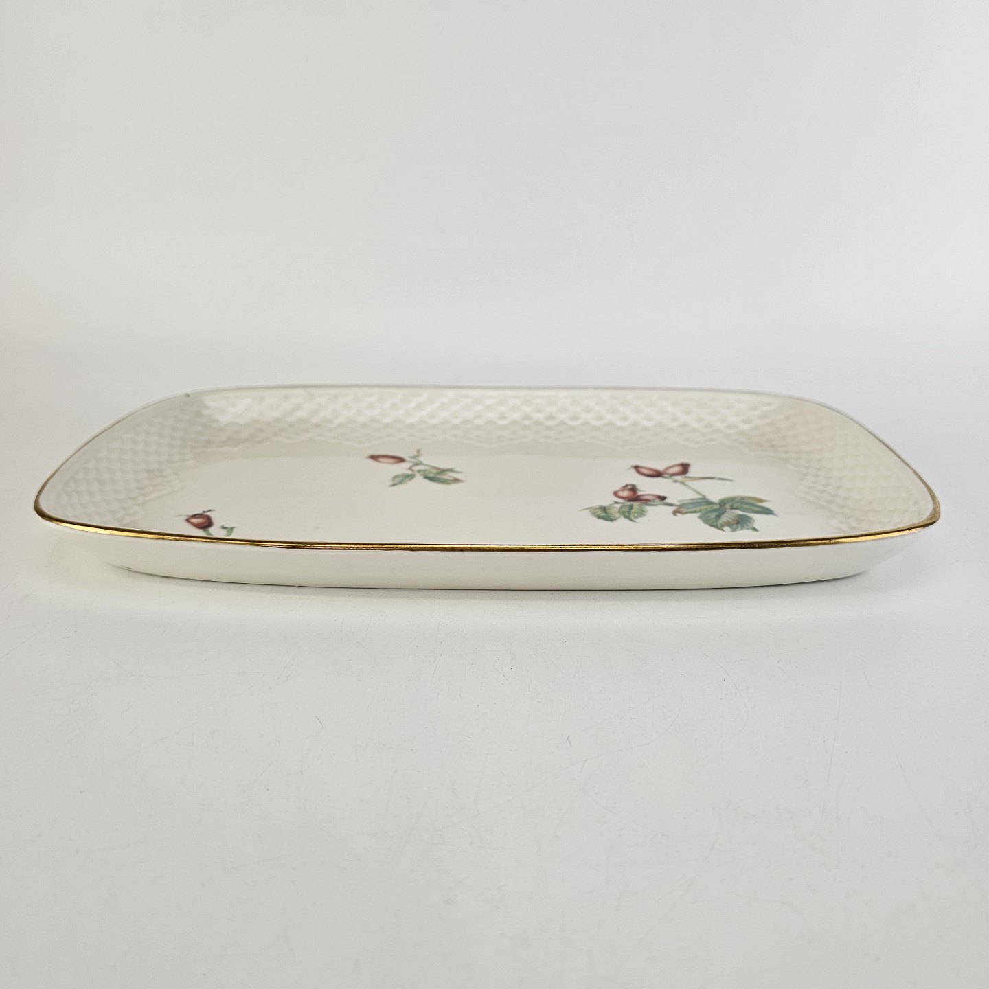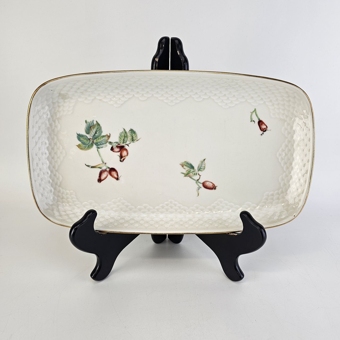 Balder er cremefarvet porcelæn i skælform, dekoreret med hyben og guldkant.