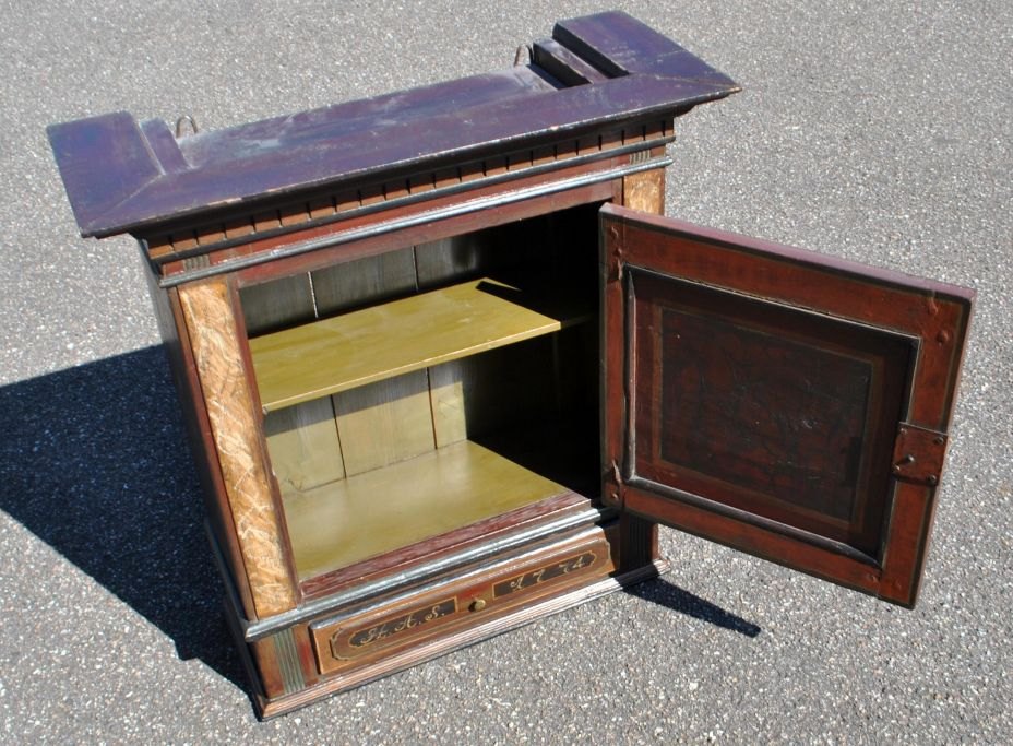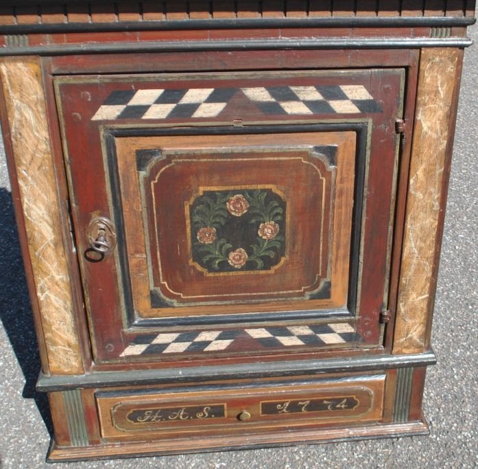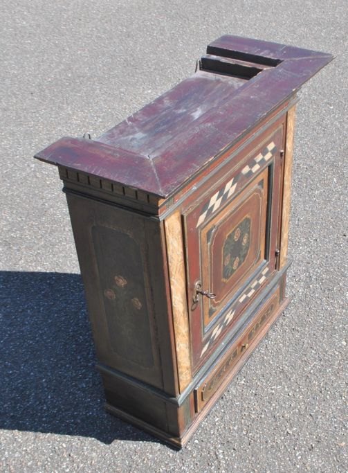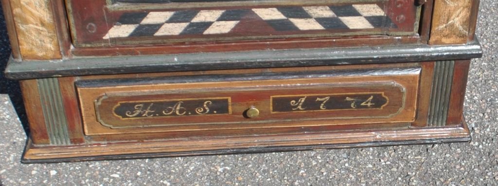 Danish Louis XVI painted hanging cabinet, 1774. With dentils at the top and columns on the sides. With one drawer. Painted with a checkerboard pattern and a flower in the middle of the door. Inside with a shelf - painted green. With the initials: HAS and 1774 on the front of the drawer. H.: 75 cm. W.: 70 cm. D.: 30 cm.