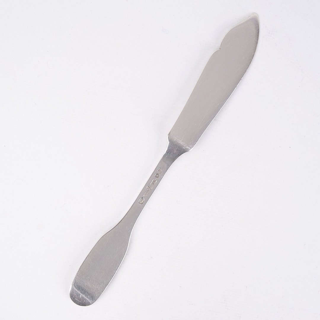 Fiskekniv i mønster nr. 19 af Evald Nielsen. Sølv 830s, stemplet. Elegant dansk sølvdesign i klassisk stil.