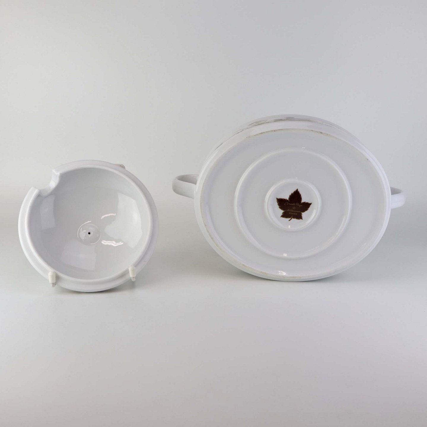 Text available in Danish: Ragout fad i porcelæn med låg og hanke, som er dekoreret med motiv af ænder fra stellet Jagtstel.