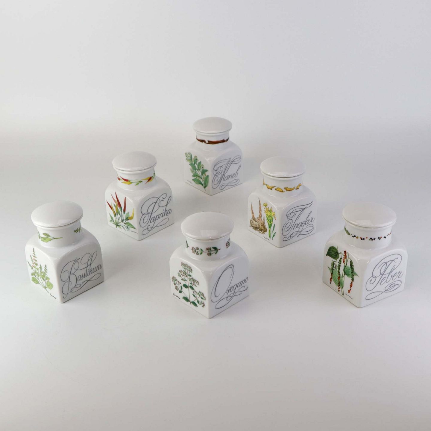 Forskellige krydderurte krukker i porcelæn med aftagelig top og gummiforsejling dekoreret med urtemotiv og tekst.
