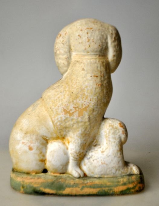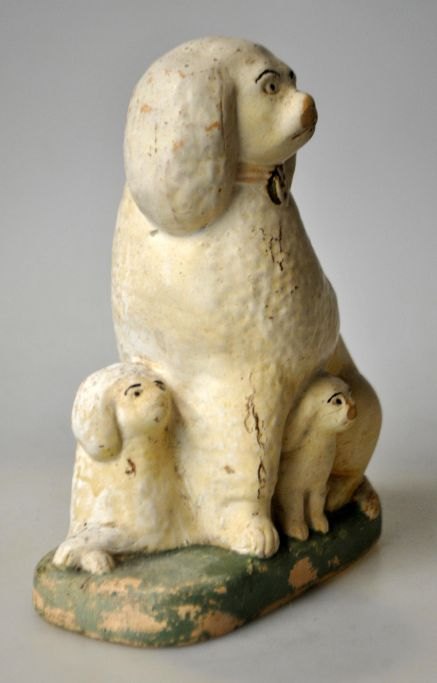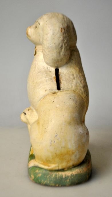 Money box in cold-painted clay, 19th century. Bornholm. Denmark. Money box in the shape of a poodle dog with two puppies. H.: 18 cm.