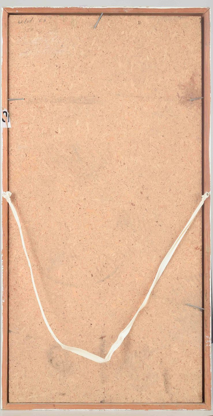Et modernistisk maleri, hvor genkendelige elementer som et glas og en bog synes antydet midt i den geometriske og organiske abstraktion. De turkise, blå og røde farveflader skaber en rytmisk bevægelse, der giver værket både dybde og stoflighed.