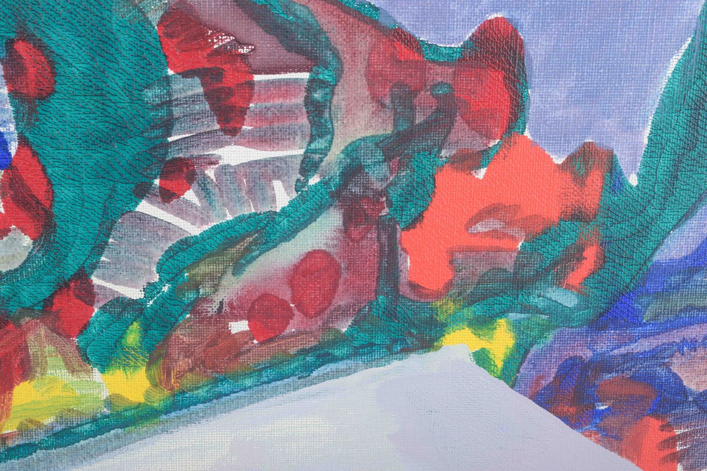 A coloristic and expressive modernist landscape, where vibrant greens, reds, and yellows merge into organic fields. The composition is marked by a dynamic contrast between the colorful foreground and the calm blue mountain silhouettes in the background, evoking a dreamlike, almost abstract landscape mood.