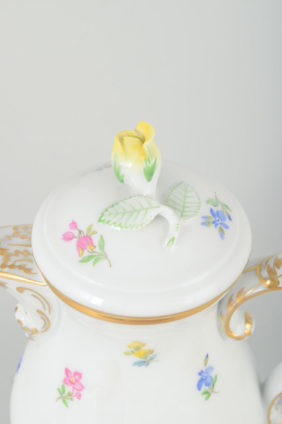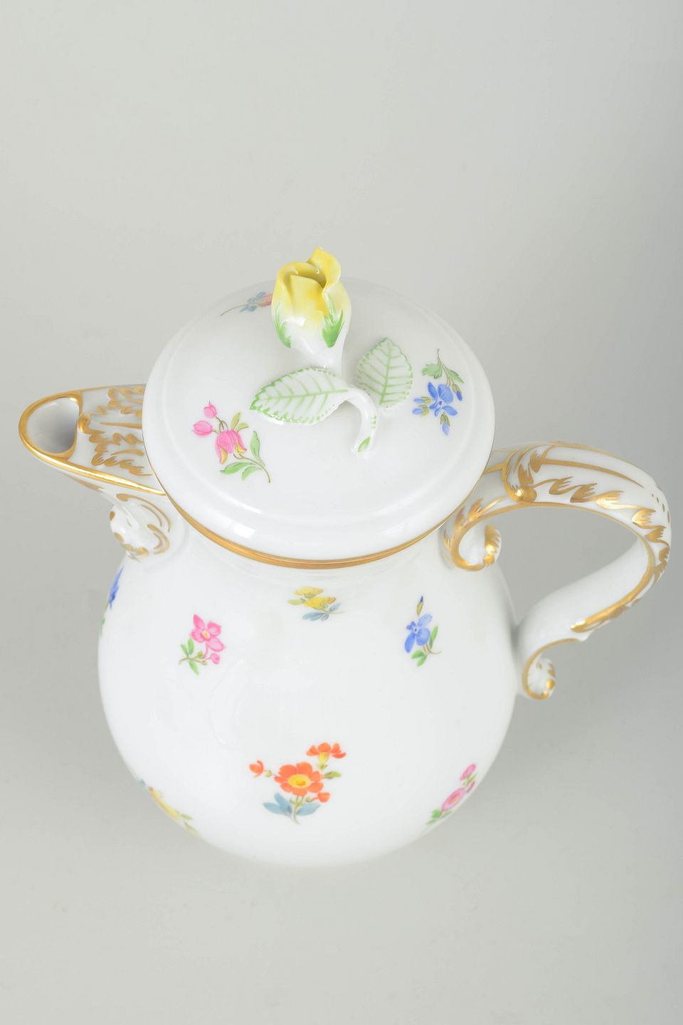 Elegant kaffekande i porcelæn, håndmalet med flerfarvede blomsterdekorationer og detaljer i forgyldning. Låget afsluttes med knop i form af en blomst, håndmalet og formet i porcelæn. Klassisk svungen form med buet hank og tud.
