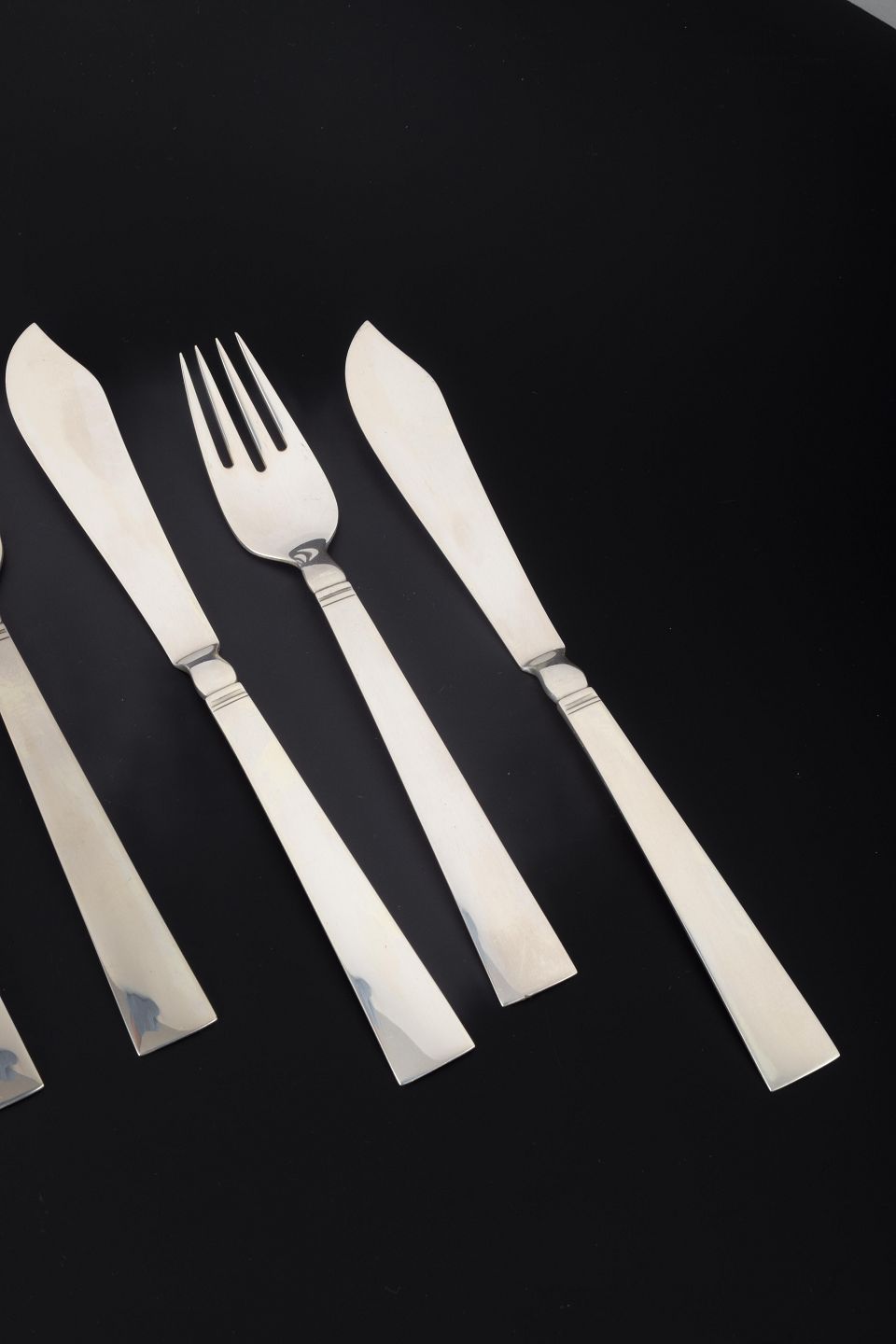 Sæt bestående af 8 dele fiskebestik til 4 personer i det elegante “Blok / Acadia”-mønster, designet af Harald Nielsen i 1918. Hver kuvert består af en fiskekniv og en fiskegaffel. Mønstret er karakteriseret ved en stram, funktionalistisk formgivning med glatte flader og geometriske proportioner.