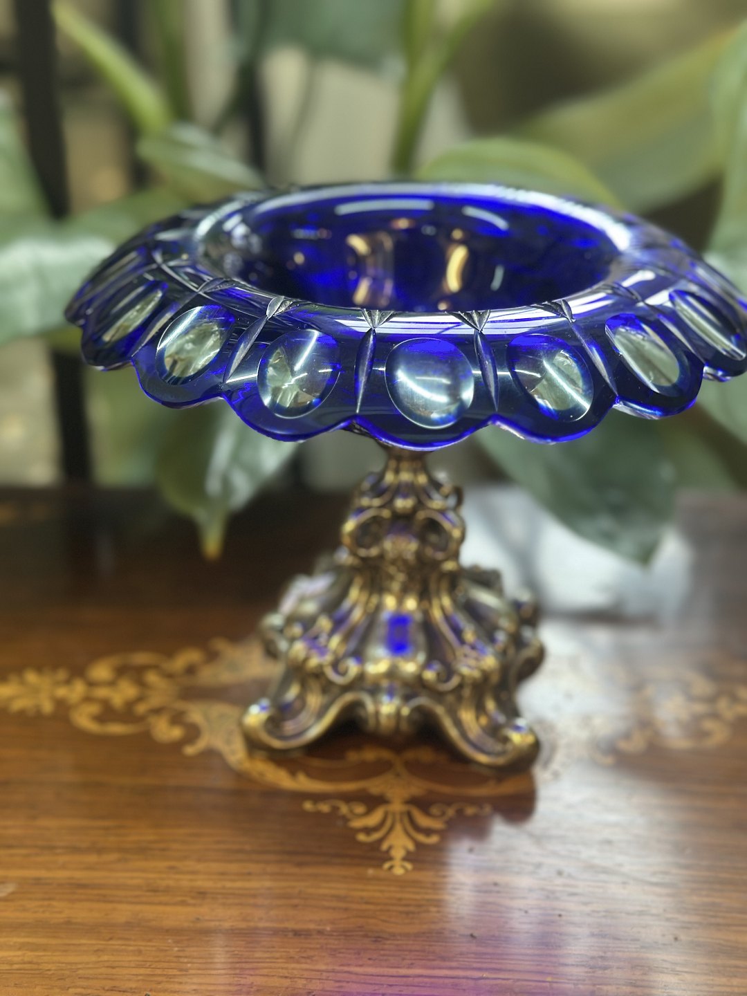Bohemia Rund skål med bølget kant og stor åbning monteret på en ornamenteret metalfod i baroksstill .sølvplet med dekorerede akantusblade og svungne fødder