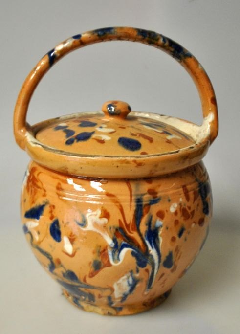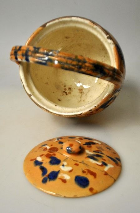 Lille dansk barselsspand, 19. årh. Rødler med glasur i blå, hvide og røde farver. Med hank og låg. H: 21 cm.