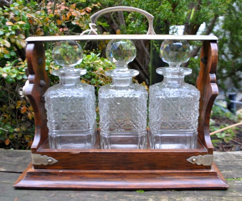 Tantalus af egetræ med tre karafler af krystal med propper. England. 19. årh.
