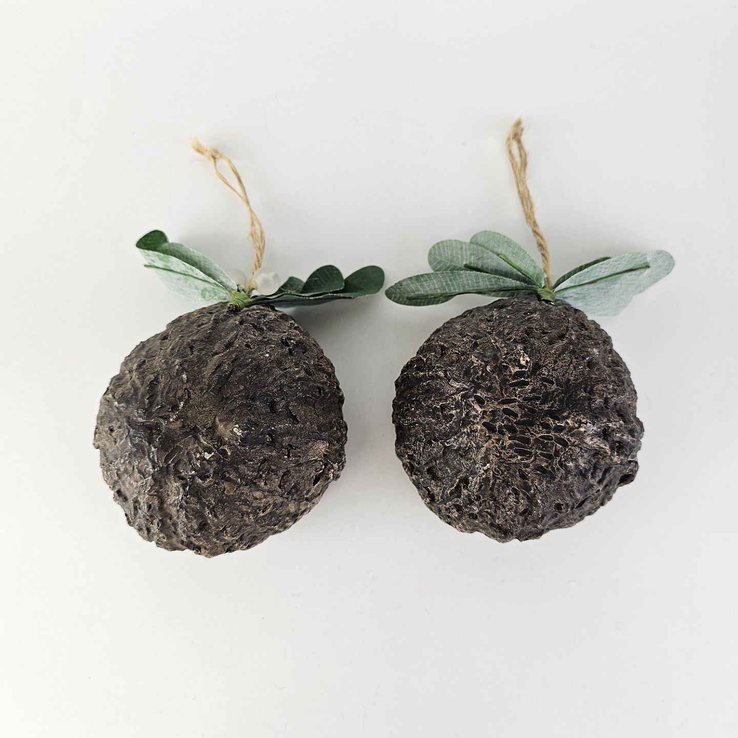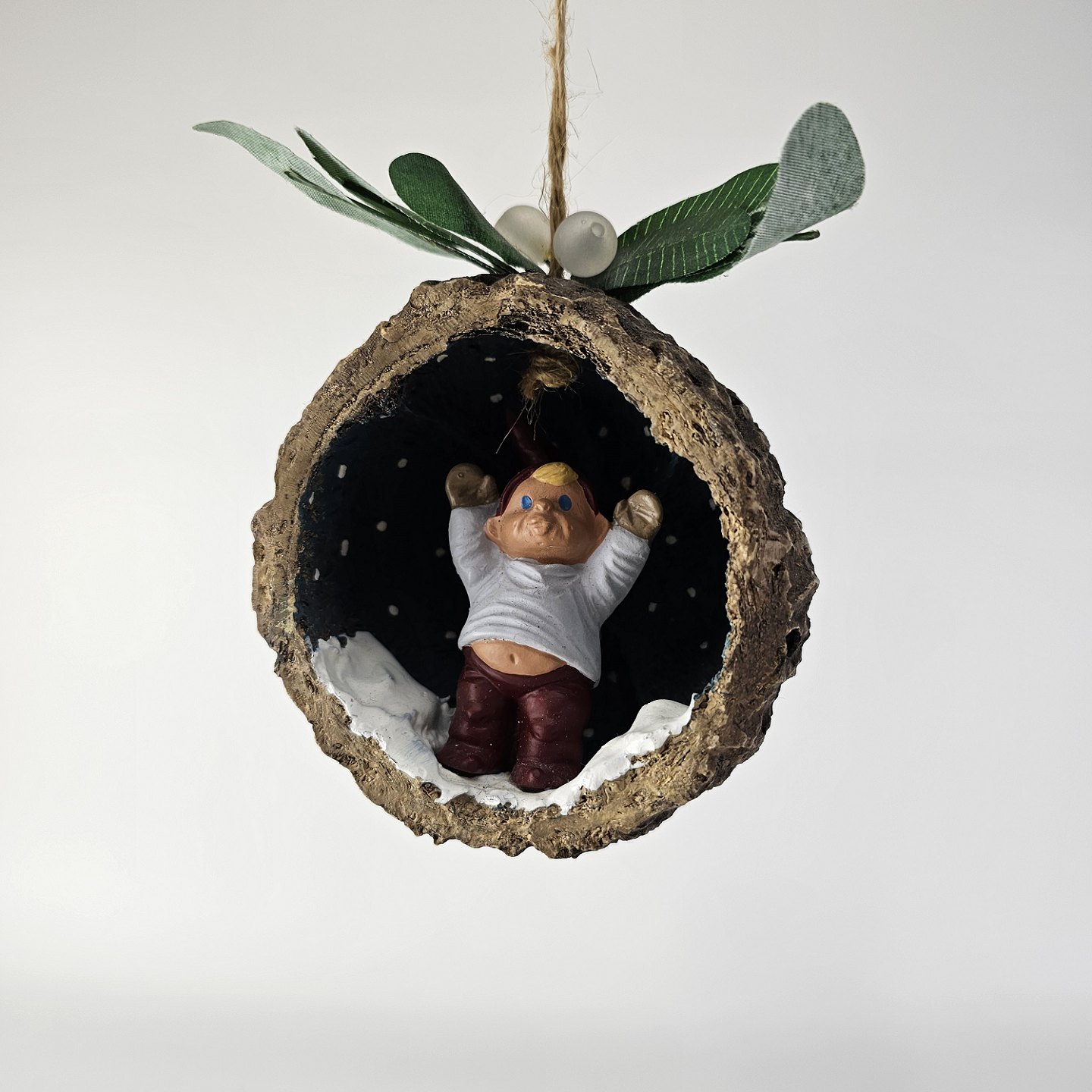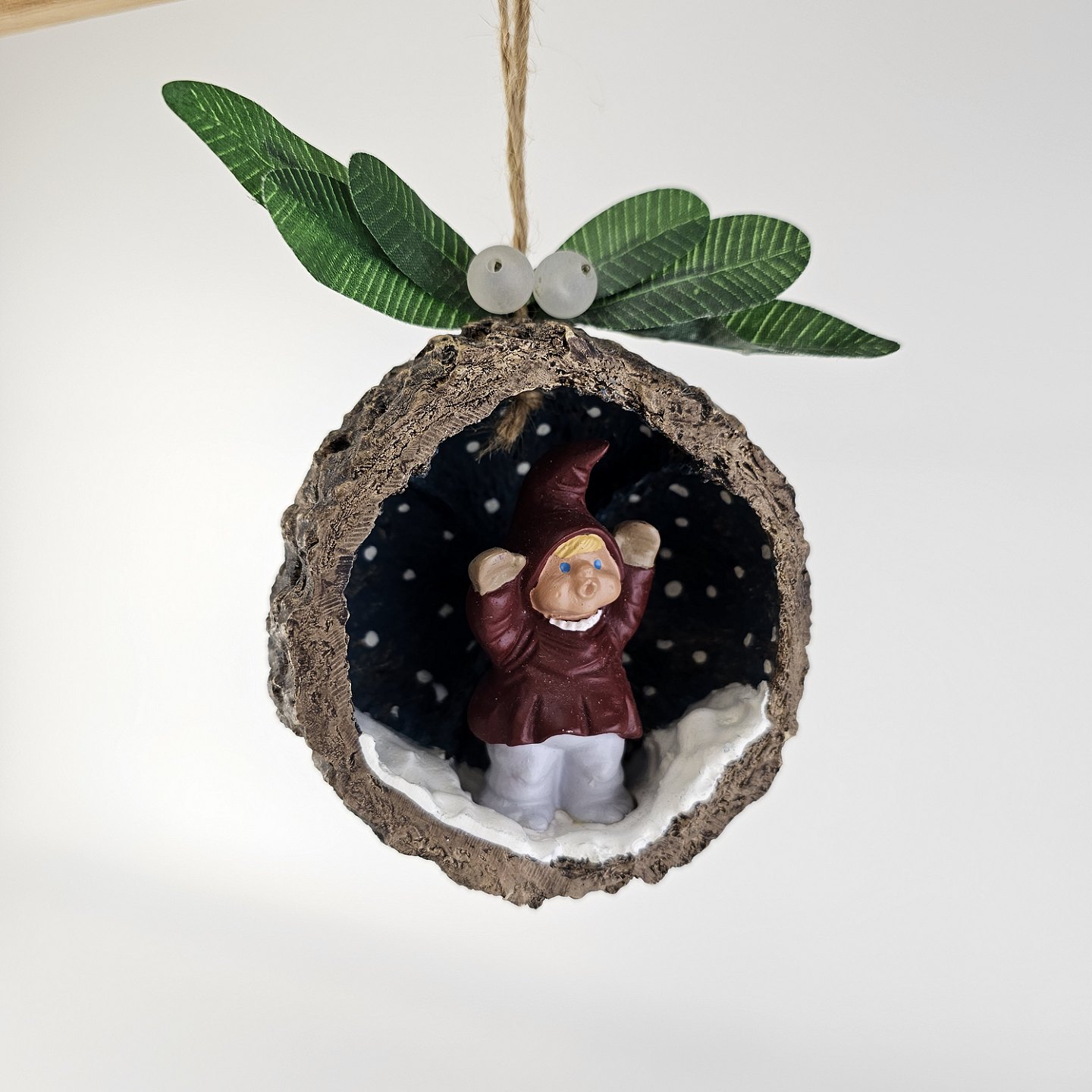 Figursæt til ophæng med motiv af nisserne Mai og Max i kokosnødder