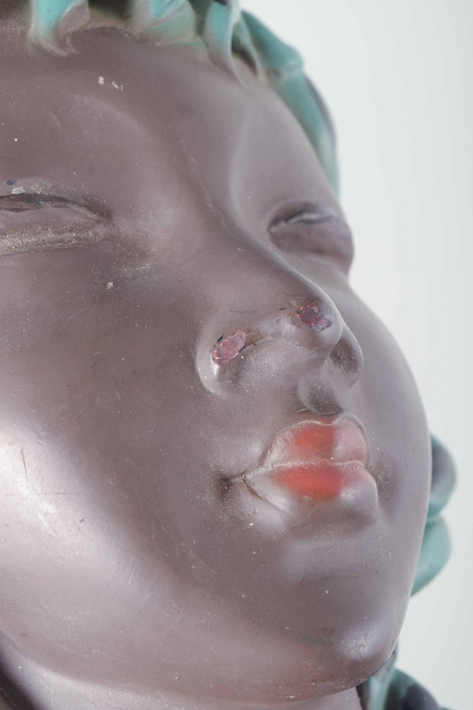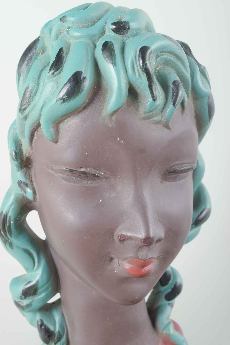 Dekorativ italiensk keramikbuste af kvindehoved med turkise og sorte hårtoner samt rødlig bluse. Udført i et karakteristisk stiliseret formsprog for perioden.