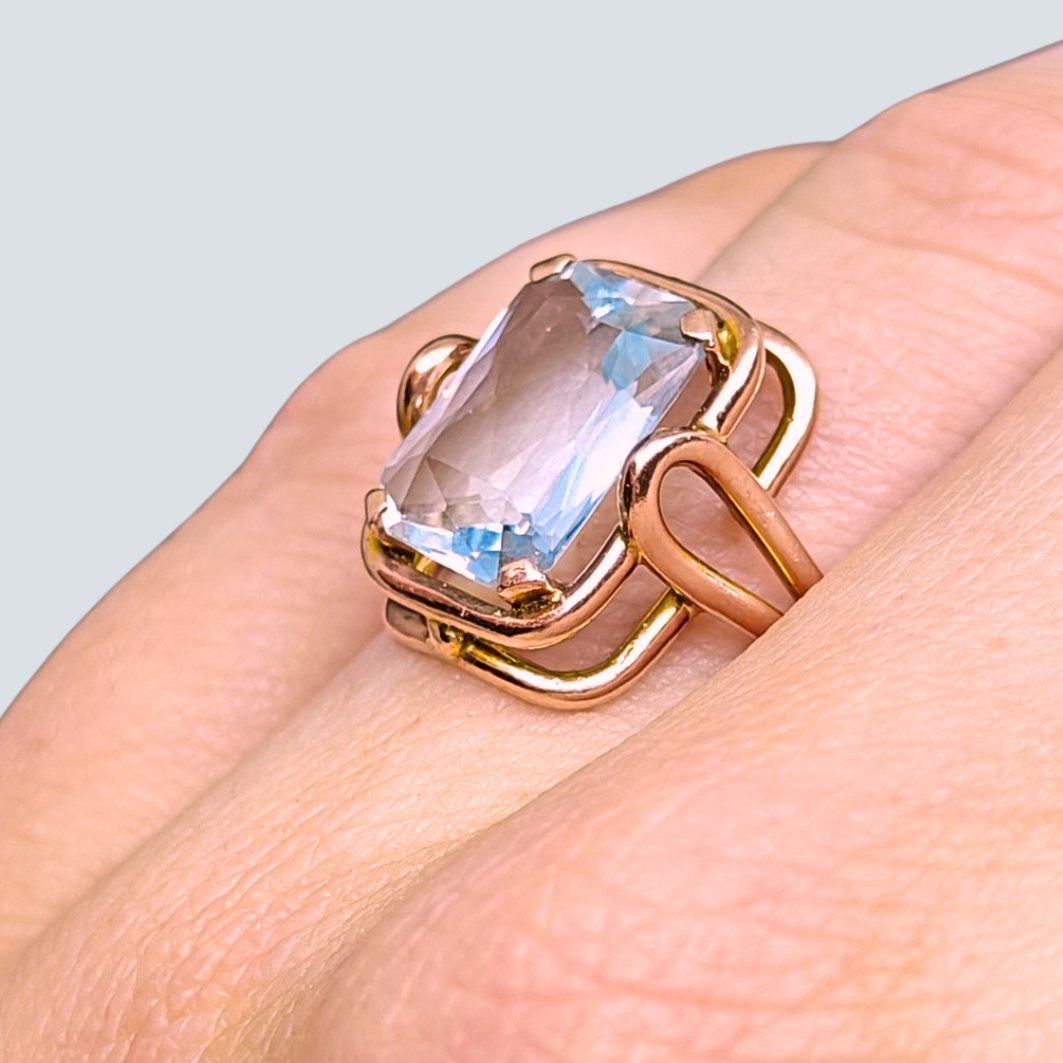 Ring i 14 kt. rosaguld, prydet med stor akvamarin.