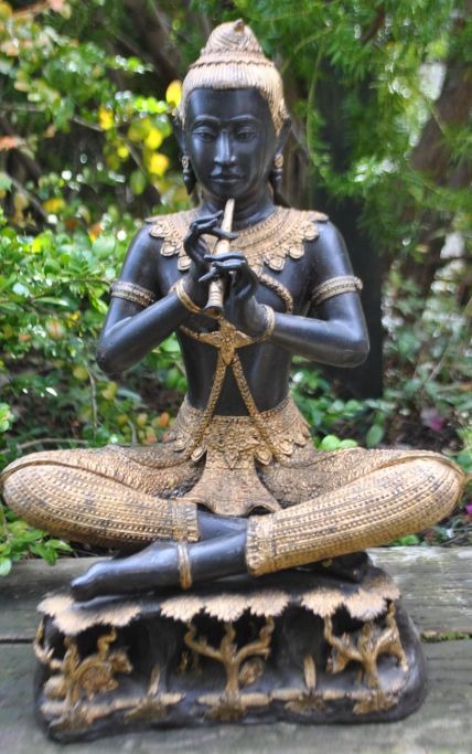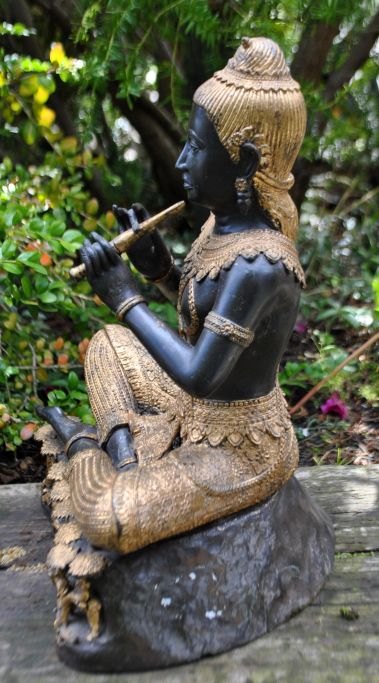 Fløjtespillende tempelmand i delvist forgyldt bronze, 20. årh.