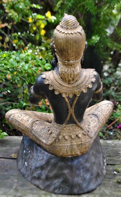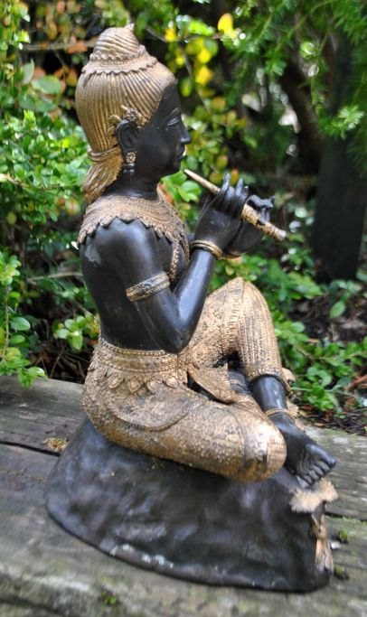 Fløjtespillende tempelmand i delvist forgyldt bronze, 20. årh. Cire perdue. Siddende på sokkel med udsmykninger af træer, bl.a. en elefant, harer og en ko. H: 36 cm. B: 26 cm. D: 19 cm.