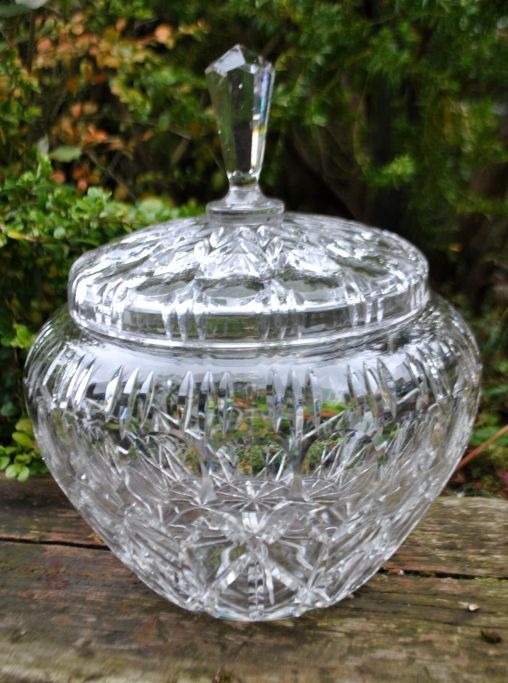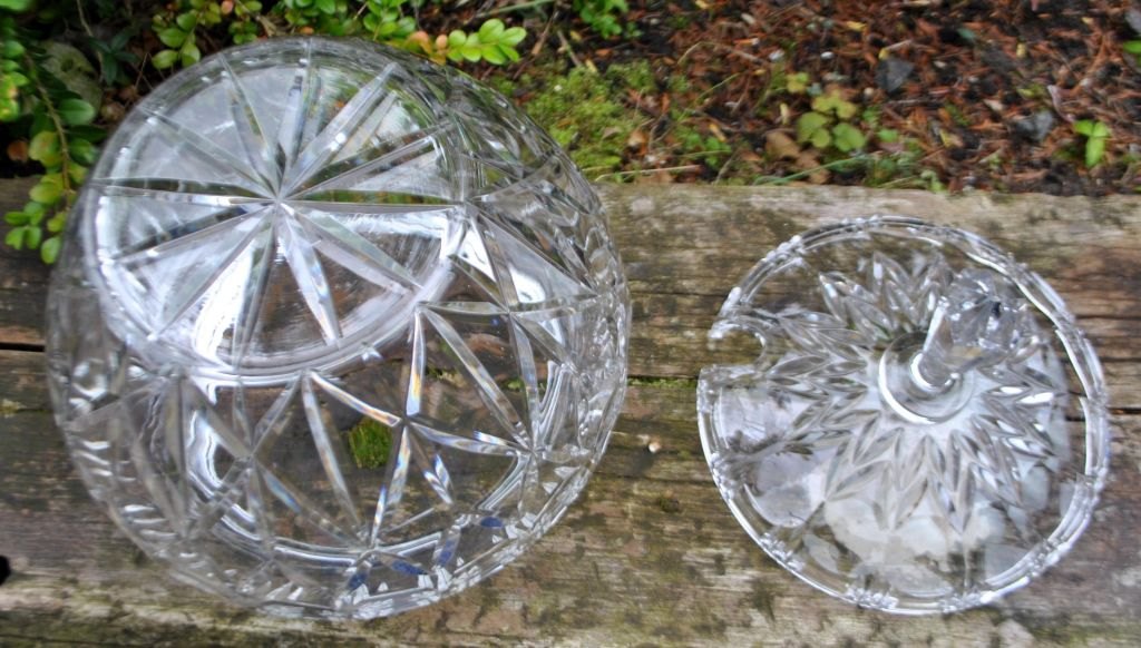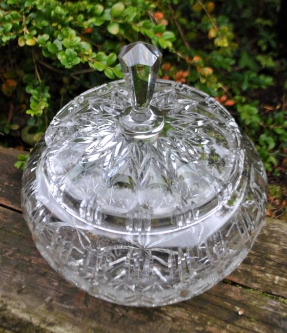 Punchbowle i krystal med låg, 20. årh. Mange facetter. Låget har hul til punchske. H: 32 cm. Dia: 27 cm.
