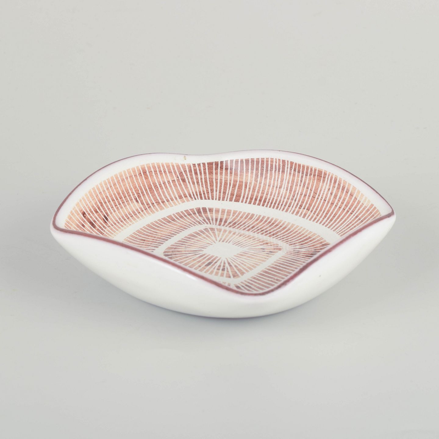 Lille organisk formet skål/fad i glaseret stentøj med karakteristisk grafisk radialdekoration i rødlige og hvide toner.