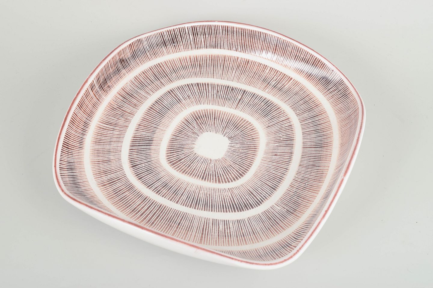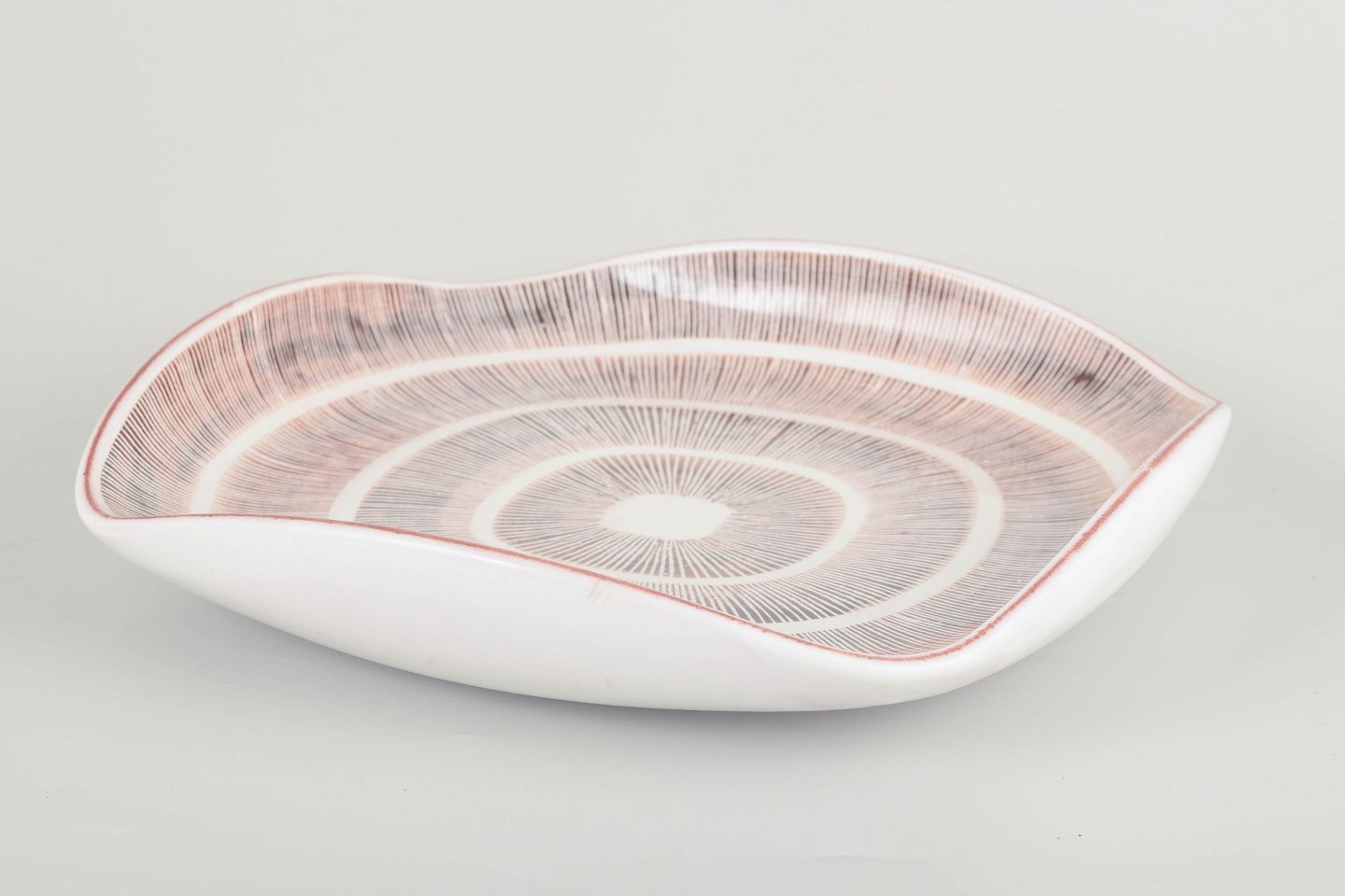 Organisk formet serveringsfad i glaseret stentøj med grafisk radialdekoration i rødlige og hvide toner.