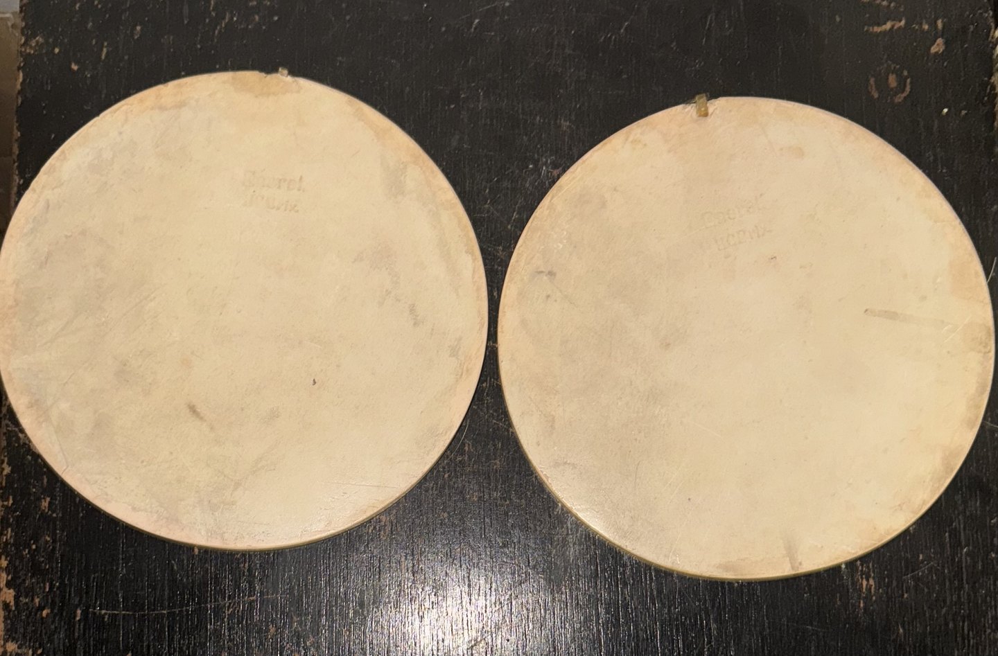 Par platter med motiv af Bertel Thorvaldsens “Natten & Dagen” i relief. Udført på Hans Christian Brix (1831-1907) værksted i gips i slutningen af 19. Århundrede. For at fremhæve relieffet er bunden malet Bordeaux. Platten fremstår i god stand med få brugsspor på bagsiden, hvor producentens navn er påstemplet - H. C. Brix. Diameter 18,3 cm