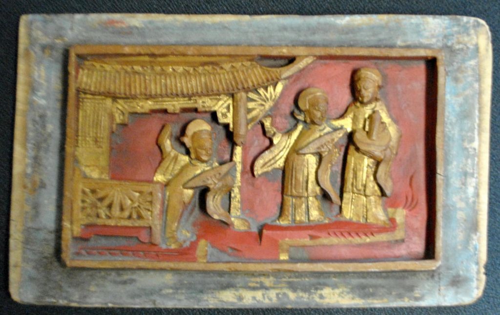 Antik kinesisk bemalet træskæring, 19. årh. Med sceneri med kvinder i en bygning. 15 x 24 cm.