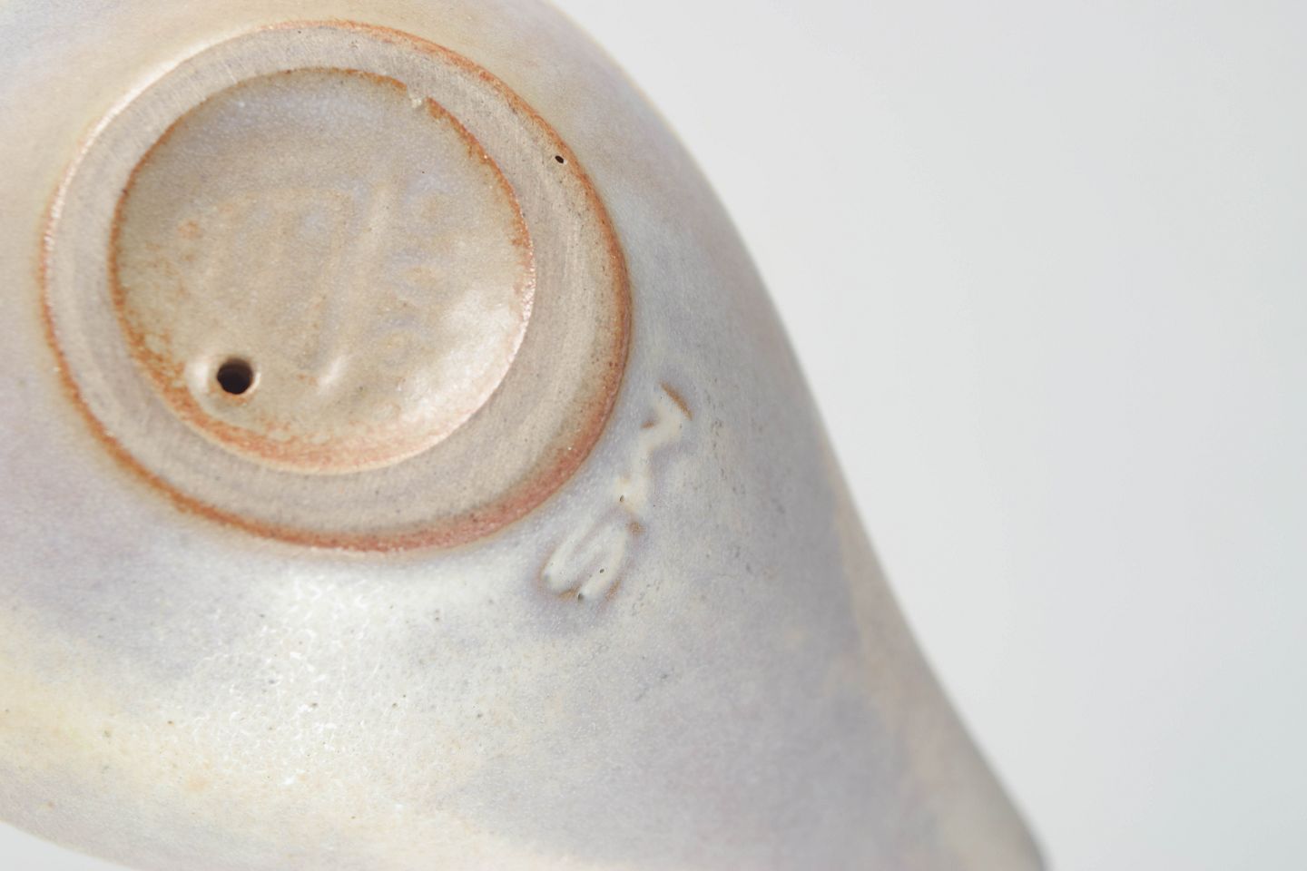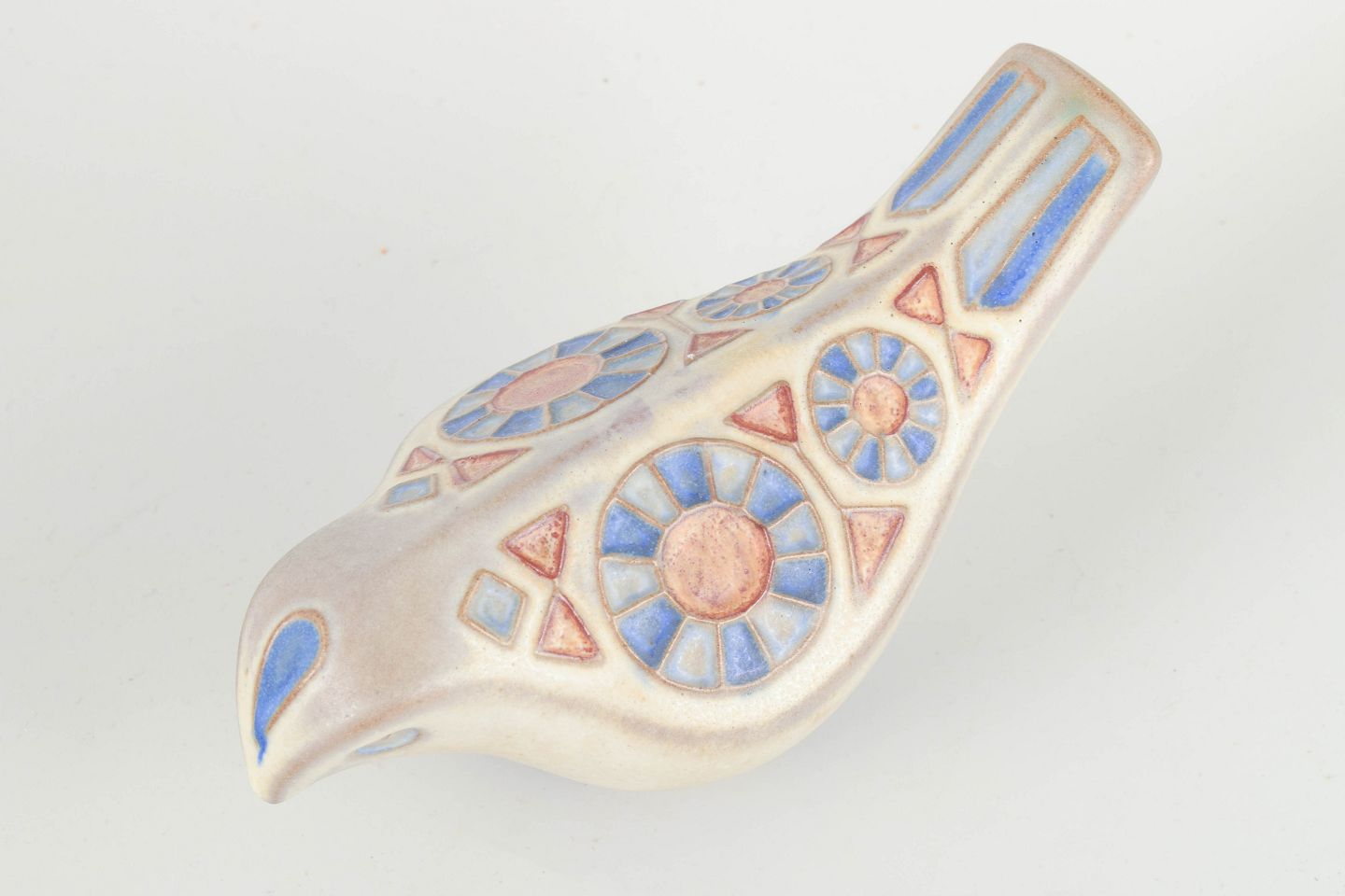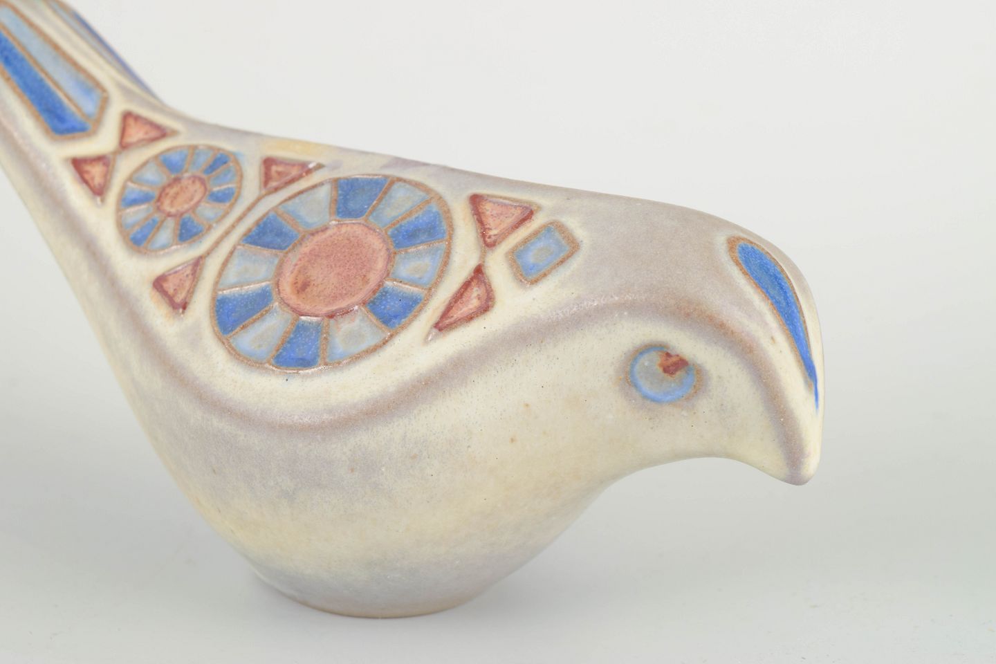 Skulpturel fuglefigur i glaseret stentøj med hånddekorerede blomster- og geometriske motiver i blå og terrakotta nuancer på lys bund.